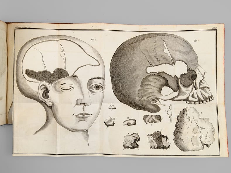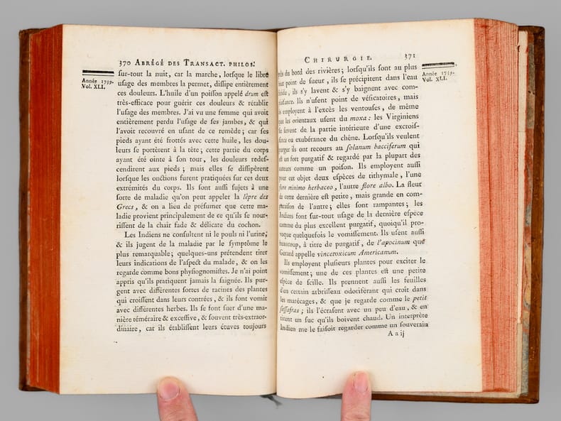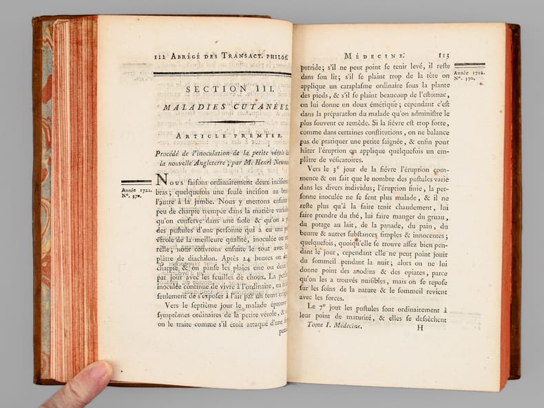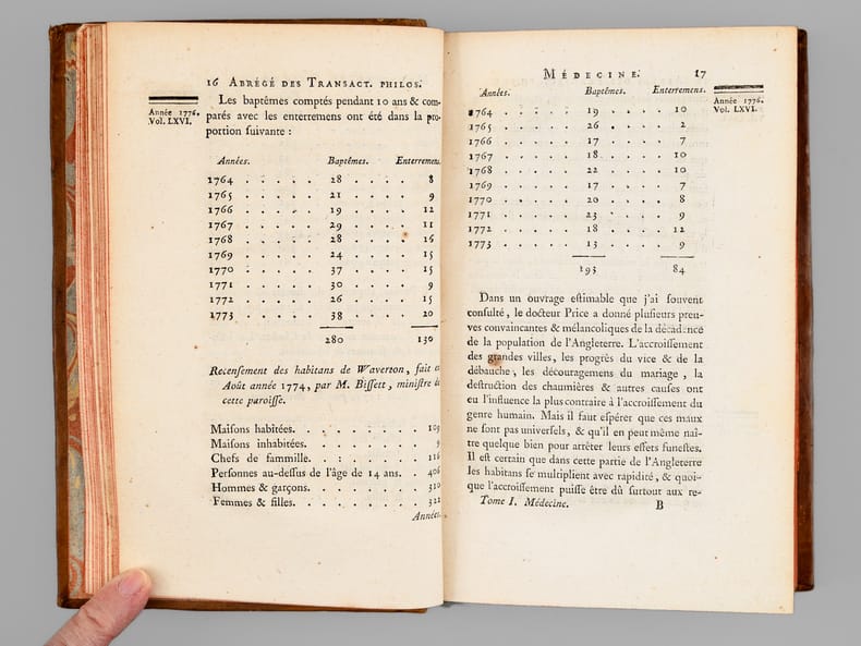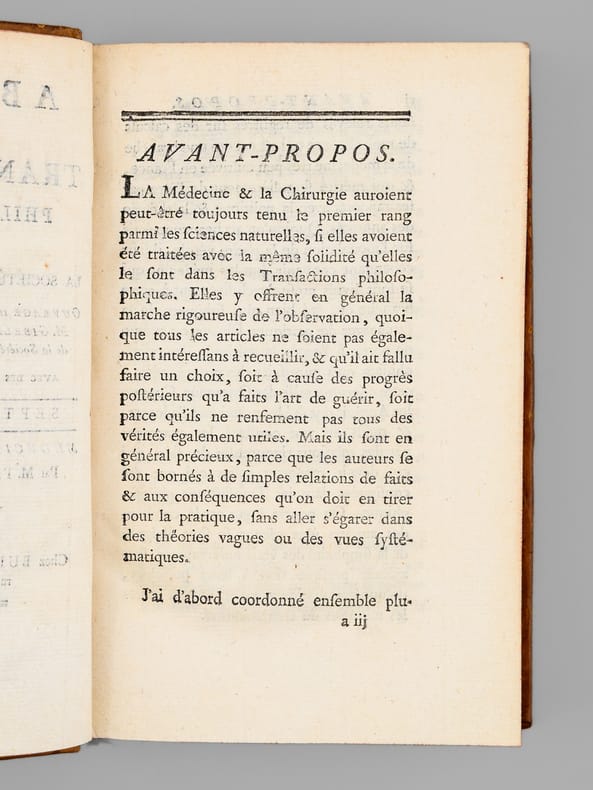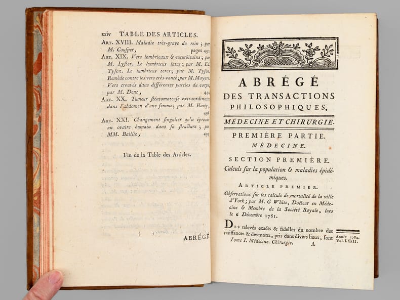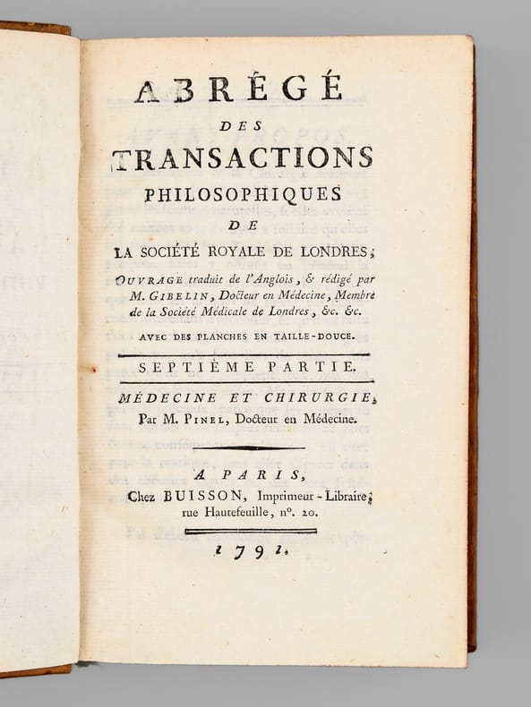 Bon exemplaire, complet de la 7e Partie de "l'Abrégé des Transactions philosophiques de la Société royale de Londres" rédigé par Pinel et complet des 2 belles planches dépliantes.