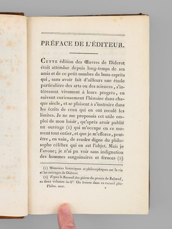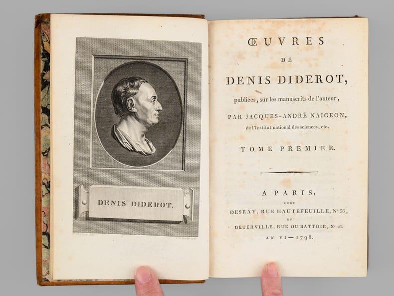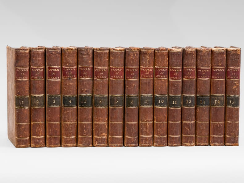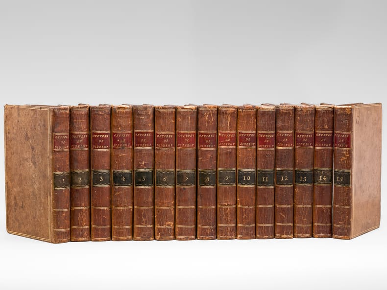 Exemplaire bien complet, et reliure plein veau d'époque, de cette édition, "la meilleure et la plus complète des éditions du XVIIIe siècle" selon Tchemerzine ; elle fut publiée par Naigeon directement sur les manuscrits de Diderot. L'exemplaire est bien complet des 16 planches hors texte dans le tome 2, et du grand tableau dépliant du tome 3. Etat très satisfaisant (dos secs, usures avec petits mq. en coiffes sup., bon état par ailleurs). Tchemerzine, IV, 474