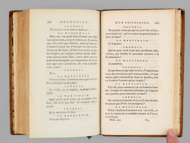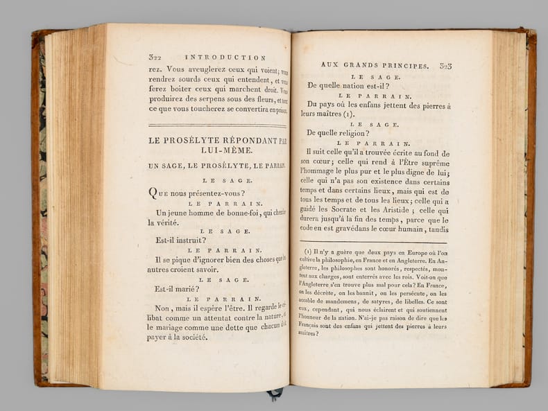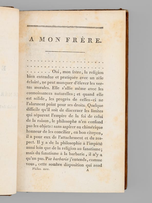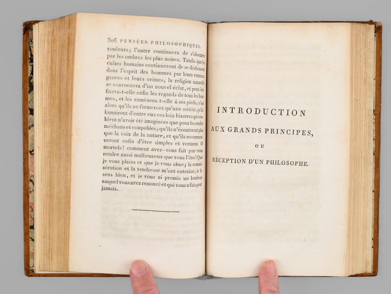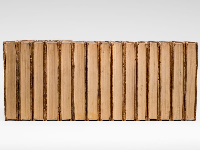 15 vol. in-8 reliure de l'époque plein veau brun, dos lisse, Chez Desray, et Deterville, Paris, An VI, 1798, Tome I : xxxiii-493 pp. et 1 f. n. ch., 1 f. blanc ; Tome II : 2 ff., 476 pp. et 1 f. n. ch., avec 16 planches hors texte (7 et 9) ; Tome III : 2 ff., 483 pp. avec une grand tableau dépliante ("Système figuré des Connaissances humaines") ; Tome IV : 2 ff., 590 pp., 1 f. n. ch. et 2 ff. blancs ; Tome V : 2 ff., 567 pp. et 1 f. blanc ; Tome VI : 2 ff., 564 pp. ; Tome VII : 2 ff., 522 pp. ; Tome VIII : 2 ff., 492 pp., 1 f. n. ch. et 1 f. blanc ; Tome IX : 2 ff., 516 pp. ; Tome X : 2 ff., 519 pp. ; Tome XI : 2 ff., 458 pp. et 1 f. blanc ; Tome XII : 2 ff., 467 pp. ; Tome XIII : VIII-485 pp. ; Tome XIV : 2 ff., 514 pp. ; Tome XV : 2 ff., 501 pp.
