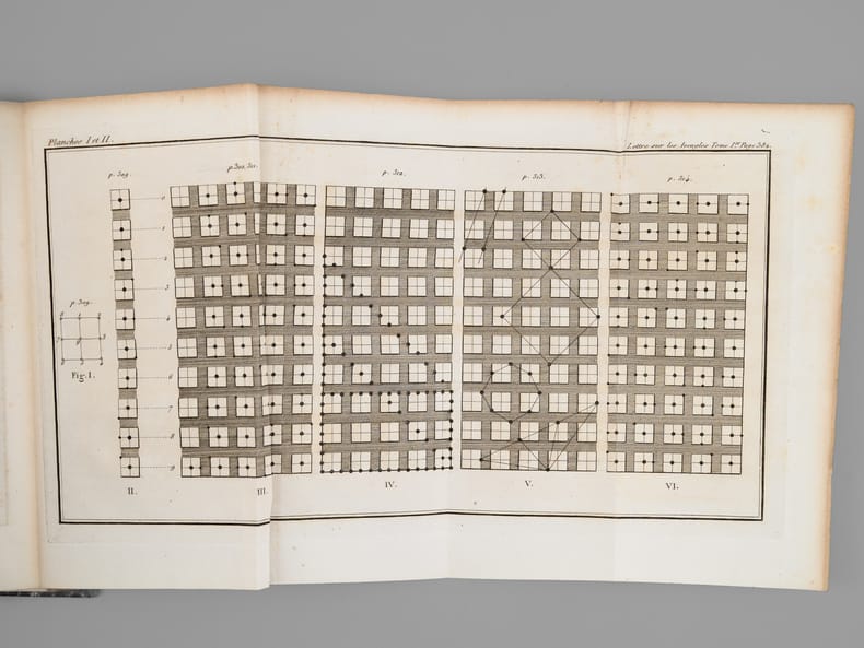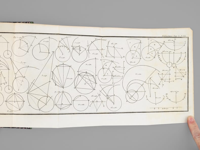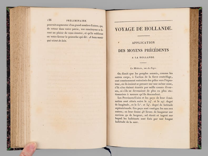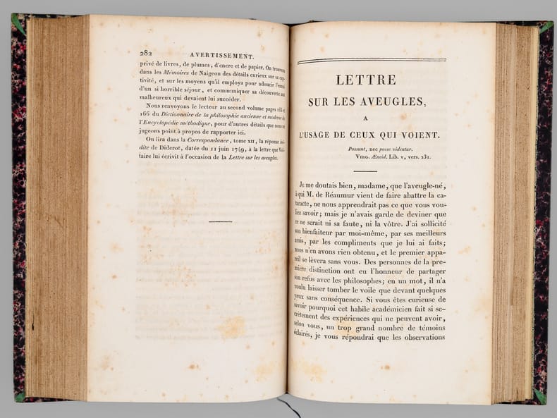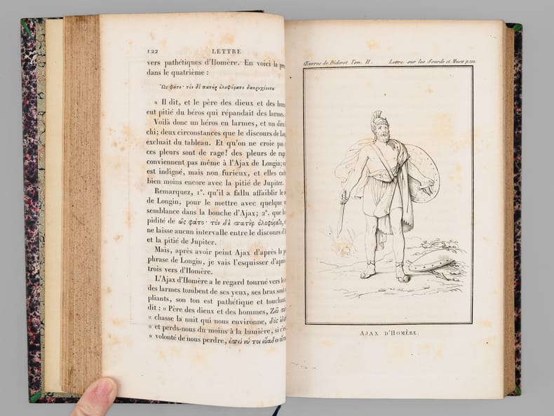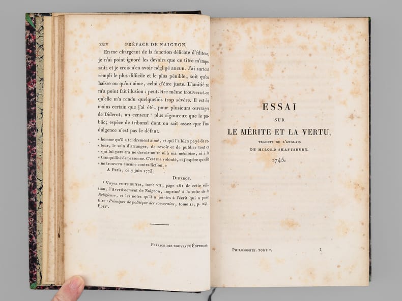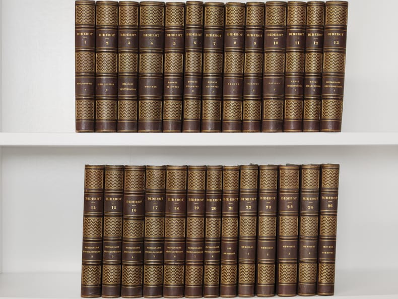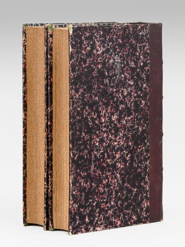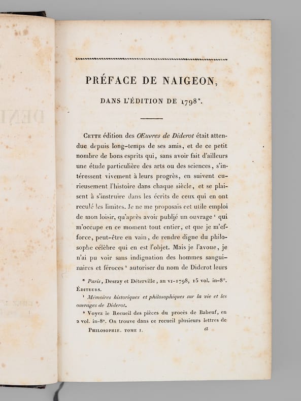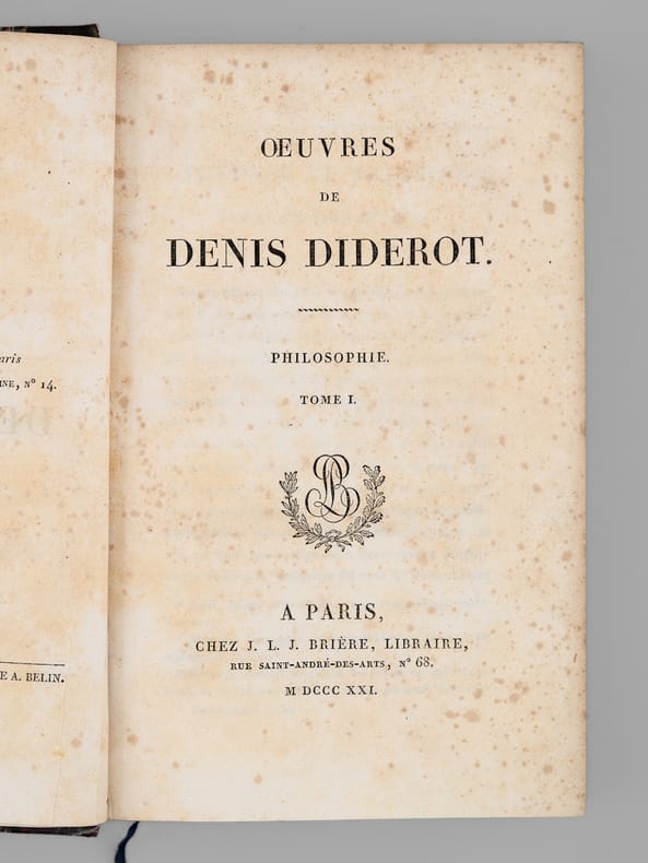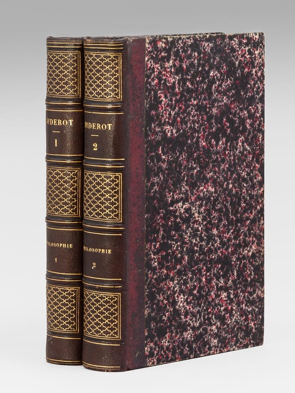 26 vol. in-8 reliure de l'époque demi-chagrin noir, dos à 4 nerfs dorés richement orné, Chez J. L. J. Brière, Paris, 1821 [ Tomes 1 à 21 et 26 ], Paulin, Alexandre Mesnier, Paris, 1831-1831 [ Tomes 22, 23, 24 ], Paulin, Paris, 1834 [Tome 25 : Deuxième édition augmentée ]. Rappel du titre complet et détail des planches : Oeuvres de Denis Diderot (22 Tomes - Complet) [ Avec : ] Mémoires, Correspondance et Ouvrages inédits de Diderot de 1759 à 178, publiés d'après les manuscrits confiés, en mourant, par l'auteur à Grimm (4 Tomes - Complet) [ Ensemble : 26 Volumes ] Tomes 1 et 2 : Philosophie (Tome 1 : Planche I et II dépliante (Système de Saunderson pour les aveugles) ; Tome 2 ; Une planche hors texte) ; Tome 3 : Mélanges de littérature et de philosophie. ; Tome 4 : Théâtre ; Tomes 5, 6, 7 : Romans et Contes ; Tomes 8, 9, 10 : Salons ; Mathématiques (Tome 10 : 3 planches dont une dépliante) ; Tomes 11 et 12 : Essai sur les règnes de Claude et de Néron ; Essai sur les études en Russie ; Plan d’une université pour le gouvernement de Russie ; Correspondance ; Tomes 13 à 20 : Dictionnaire encyclopédique (Tome 13 : Tableau dépliant du Système figuré des connaissances humaines ) ; Tome 21 : Mémoires historiques et philosophiques sur la Vie et les Ouvrages de D. Diderot par J. A. Naigeon (Tome 21 : Portrait de Denis Diderot par Mme Therbouche 1823, gravé par Bertonnier ) ; Tomes 22 à 25 : Mémoires, Correspondance et Ouvrages inédits de Diderot de 1759 à 1780, publiés d'après les manuscrits confiés, en mourant, par l'auteur à Grimm ; Tome 26 : Oeuvres inédites de Diderot : Le Neveu de Rameau. Voyage de Hollande. Correspondance. Table générale et analytique des matières contenues dans les Oeuvres de Diderot.