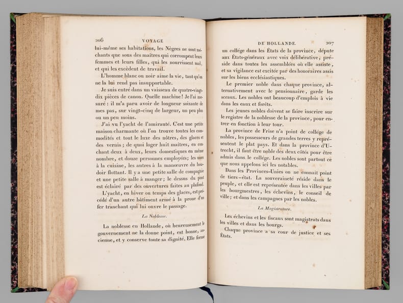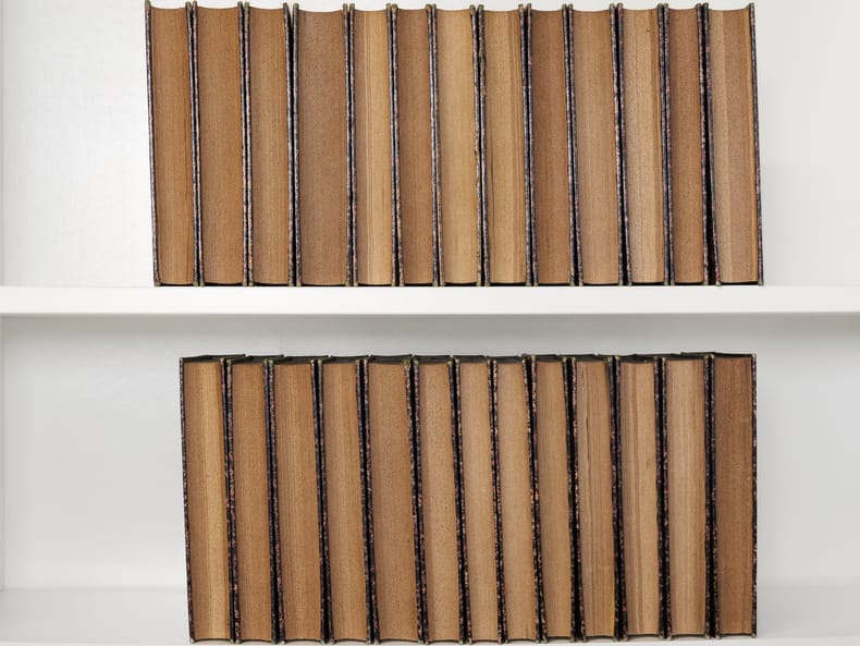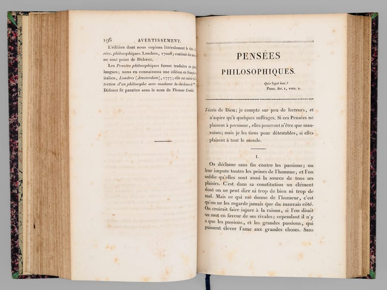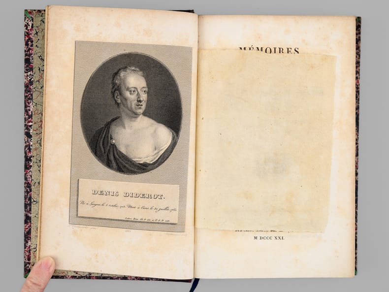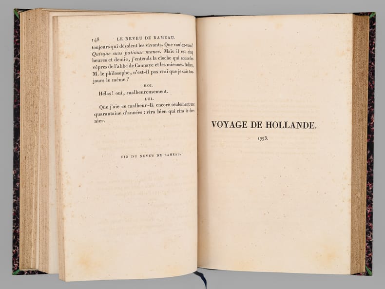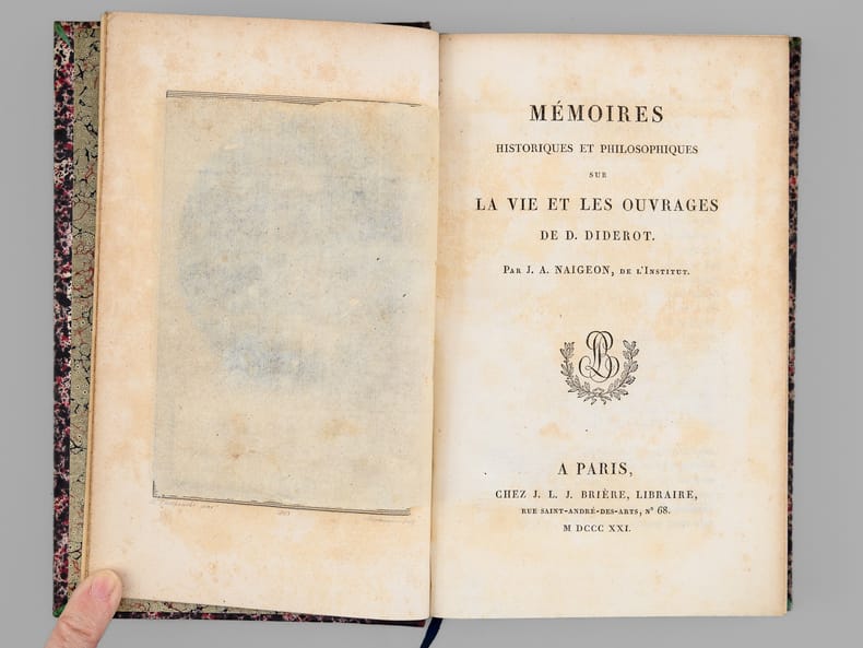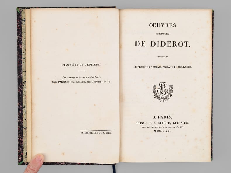 Bel exemplaire des Oeuvres de Diderot, bien complet de la véritable édition originale du "Neveu de Rameau", publiée par Brière sur le manuscrit original qui lui avait été confié par la fille de Diderot. Bien que la parution n'eut lieu qu'en 1823, Brière a daté le volume, comme le reste de la série, de 1821. Le volume a été relié dans cet ensemble comme le vingt-sixième et dernier, précédé non seulement des Mémoires de Naigeon sur la Vie et les Oeuvres de Diderot, mais également des 4 tomes des "Mémoires, Correspondance et Ouvrages inédits de Diderot de 1759 à 1780, publiés d'après les manuscrits confiés, en mourant, par l'auteur à Grimm" dans l'édition de Paulin et Mesnier de 1830-1831 (le tome 4 étant dans la deuxième édition augmentée publiée par Paulin seul en 1834). Etablie sur des manuscrits conservés dans le fond Diderot de la bibliothèque de L'Ermitage (Saint-Pétersbourg) dont la copie fut transmises à l'éditeur Jean-Baptiste Paulin, cette dernière série de 4 tomes contient notamment l'édition en partie originale des Lettres à Sophie Volland, et l'édition originale des "Mémoires pour servir à l'histoire de la vie et des ouvrages de Diderot, par Madame de Vandeul, sa fille". Bon exemplaire en belle reliure d'époque (un défaut dans le papier a causé un accroc en marge, n'affectant pas le texte, en début du tome 19, qq. rouss., très bon état par ailleurs). Vicaire, III, 255 ; Tchemerzine, IV, 477 (Neveu de Rameau), 478 (Oeuvres chez Brière), 480 (Mémoires chez Paulin)
