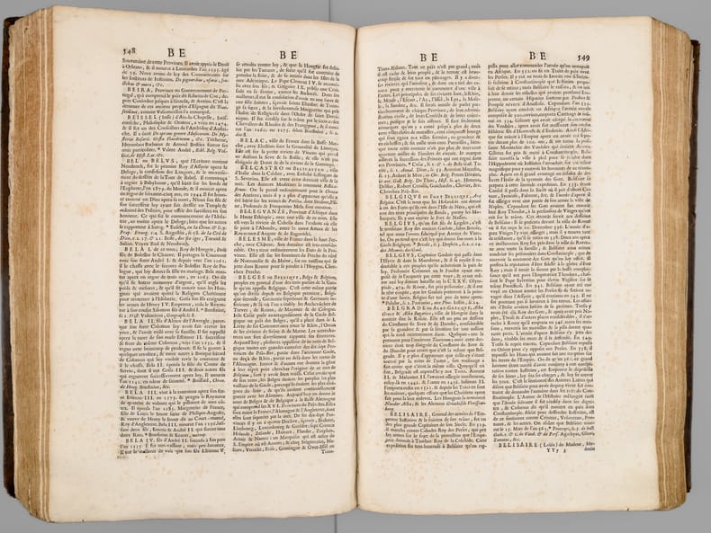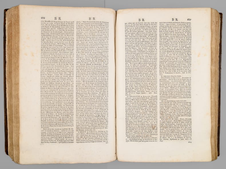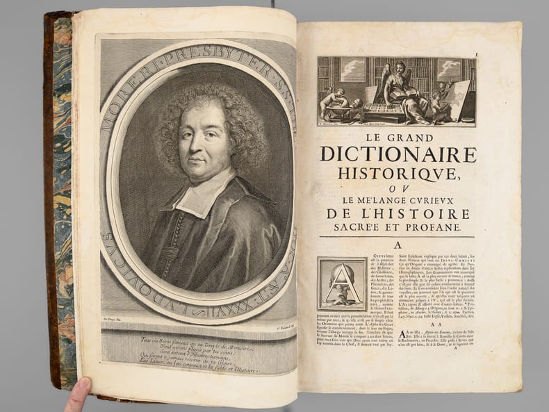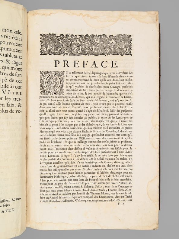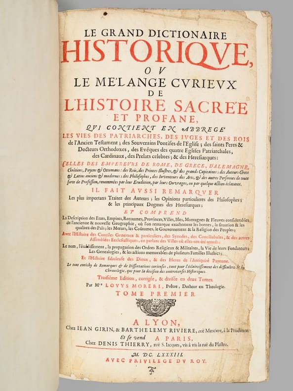 Troisième Edition, corrigée & divisée en deux Tomes, par Mr. Louis Moreri, Prêtre, Docteur en Théologie, 3 vol. fort in-folio reliure de l'époque pleine basane brune, dos à 6 nerfs orné (différences de reliure entre les tomes 1-2 et le supplément), Chez Jean Girin & Barthélémy Rivière, A Lyon, se vend à Paris, Chez Denis Thierry, 1683 et Chez Denis Thierry, 1689 (tome III), 8 ff. (titre, frontispice, "Au Roy", Préface et portrait de l'auteur), 1359 pp. ; 2 ff., 1263 pp. ; 3 ff., 1238 pp.