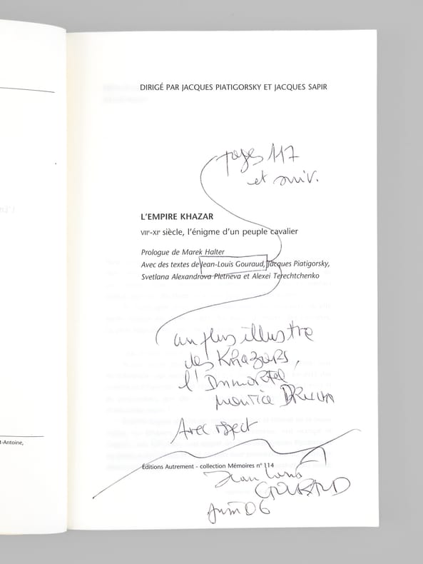 Bon état pour cet exemplaire avec un bel envoi de Jean-Louis Gouraud à Maurice Druon : "Au plus illustre des Khazars, l'Immortel Maurice Druon. Avec respect." De la bibliothèque du grand écrivain et auteur des "Rois Maudits", Maurice Druon, Secrétaire Perpétuel de l'Académie Française de 1985 à 1999 et immortel auteur avec son oncle Joseph Kessel du texte du "Chant des Partisans".