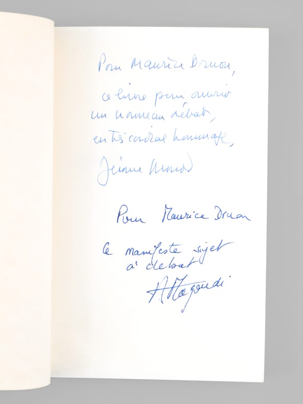 Etat très satisfaisant (qques annot. ms. par Maurice Druon, bon état par ailleurs) pour cet exemplaire avec des envois des deux auteurs : "Pour Maurice Druon, ce livre pour ouvrir un nouveau débat. En très cordial hommage" (Jérôme Monod]. "Pour Maurice Druon, ce manifeste sujet à débat" (Ali Magoudi). De la bibliothèque du grand écrivain et auteur des "Rois Maudits", Maurice Druon (1918-2009), Secrétaire Perpétuel de l'Académie Française de 1985 à 1999 et immortel auteur avec son oncle Joseph Kessel du texte du "Chant des Partisans".
