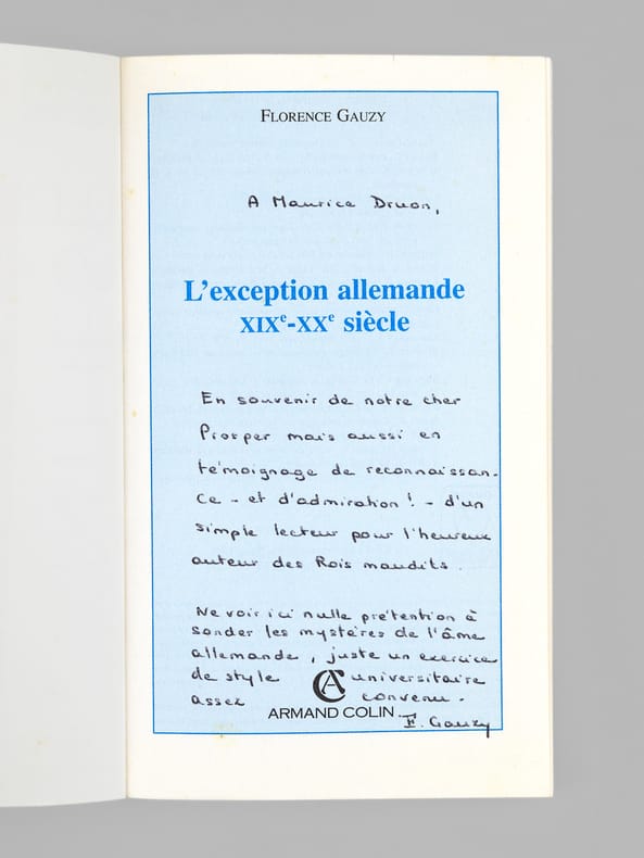 Bon état pour cet exemplaire avec une belle dédicace : "Pour Maurice Druon, en souvenir de notre cher Prosper mais aussi en témoignage de reconnaissance - et d'admiration! - d'un simple lecteur pour l'heureux auteur des Rois Maudits. Ne voir ici aucune prétention à sonder les mystères de l'âme allemande, juste un exercice de style universitaire assez convenu." De la bibliothèque du grand écrivain et auteur des "Rois Maudits", Maurice Druon (1918-2009), Secrétaire Perpétuel de l'Académie Française de 1985 à 1999 et immortel auteur avec son oncle Joseph Kessel du texte du "Chant des Partisans".