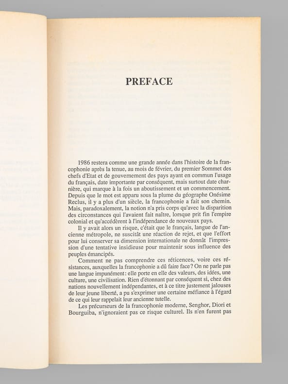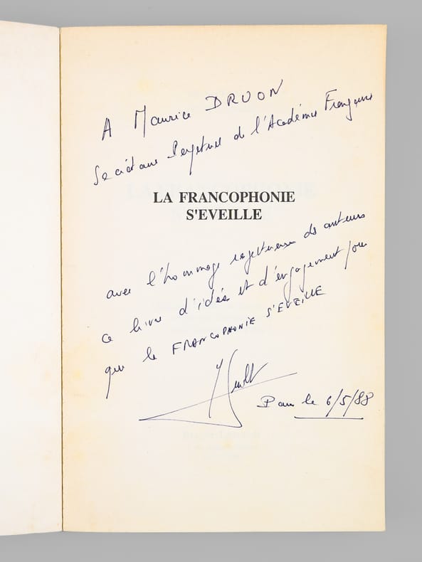 Bon état pour cet exemplaire avec un envoi à Maurice Druon : "A Maurice Druon, Secretaire Perpétuel de l'Académie Française. Avec l'hommage respectueux des auteurs, ce livre d'idées et d'engagement pour la Francophonie s'éveille". Exemplaire provenant de la bibliothèque du grand écrivain et auteur des "Rois Maudits", Maurice Druon (1918-2009), Secrétaire Perpétuel de l'Académie Française de 1985 à 1999 et immortel auteur avec son oncle Joseph Kessel du texte du "Chant des Partisans".