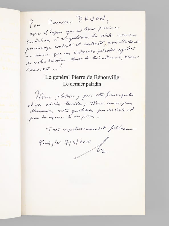 Bon état, avec un long envoi à Maurice Druon : "Pour Maurice Druon, avec l'espoir que ce livre puisse contribuer à rééquilibrer la vérité sur un personnage contesté et contrasté mais attachant... ainsi que que sur certaines périodes agitées de notre histoire dont la Résistance, aussi CALUIRE... Merci, Maître, pour votre franc-parler et vos articles lucides, mais aussi pour illuminer notre quotidien par vos écrits, et par la reprise de vos pièces. Très respectueusement et fidèlement." Exemplaire provenant de la bibliothèque du grand écrivain et auteur des "Rois Maudits", Maurice Druon (1918-2009), Secrétaire Perpétuel de l'Académie Française de 1985 à 1999 et immortel auteur avec son oncle Joseph Kessel du texte du "Chant des Partisans".