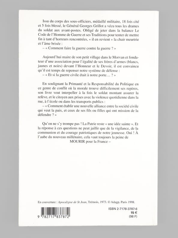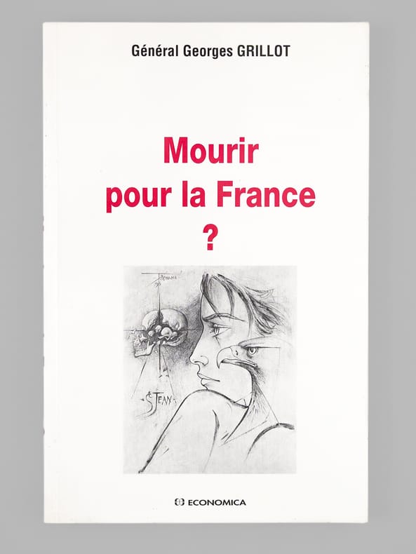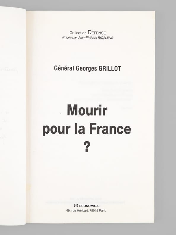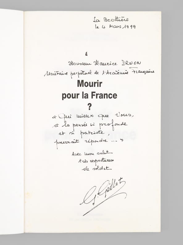 Bon état. Bel envoi ms. de l'auteur à Maurice Druon : "A Maurice Druon, secrétaire perpétuel de l'Académie Française. Mourir pour la France? "Qui mieux que vous, à la pensée si profonde et si patriote, pourrait répondre..." Avec mon salut très respectueux de soldat". Exemplaire provenant de la bibliothèque du grand écrivain et auteur des "Rois Maudits", Maurice Druon (1918-2009), Secrétaire Perpétuel de l'Académie Française de 1985 à 1999 et immortel auteur avec son oncle Joseph Kessel du texte du "Chant des Partisans".