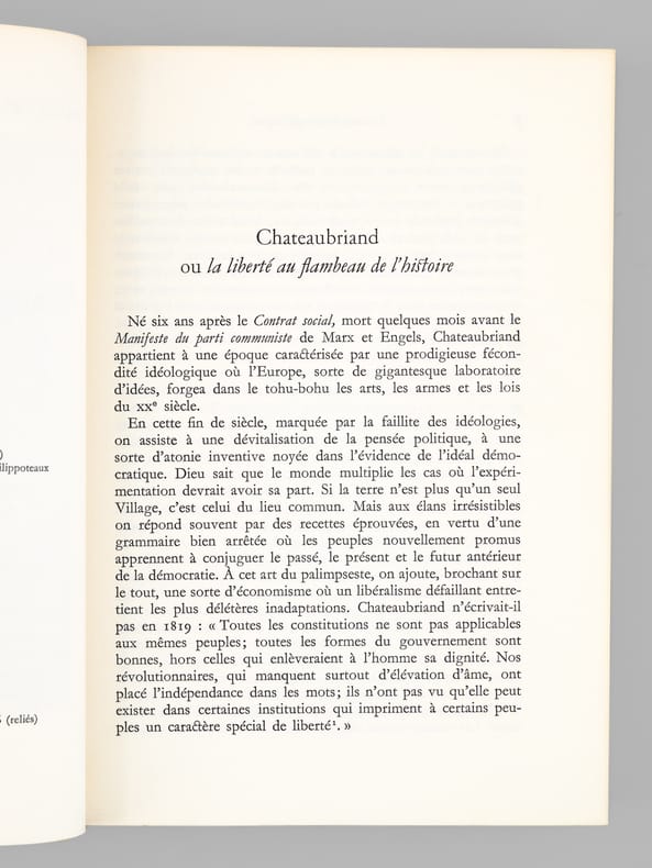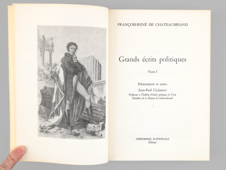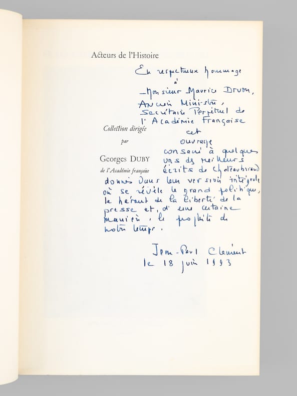 Bon état. Avec un long envoi de Jean-Paul Clément à Maurice Druon : "En respectueux hommage à Monsieur Maurice Druon, Ancien Ministre, Secrétaire Perpétuel de l'Académie Française, cet ouvrage consacré à quelques-uns des meilleurs écris de Chateaubriand, donnés dans leur version intégrale, où se révèle le grand politique, le héraut de la liberté de la presse et, d'une certaine manière, le prophète de notre temps."
