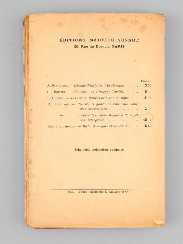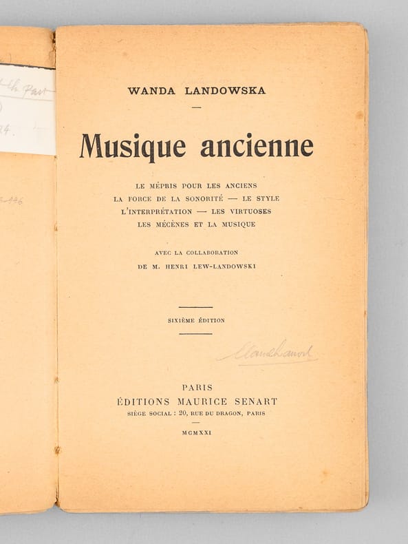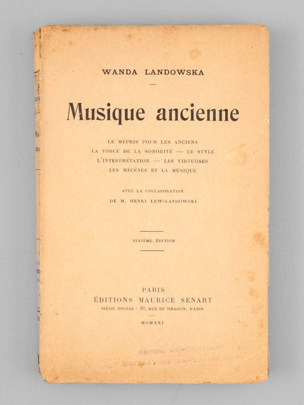 Etat très satisfaisant (petit accroc en dos, bon état par ailleurs) pour cet ouvrage de la claveciniste polonaise Wanda Landowska, dont l'édition originale était parue en 1909.