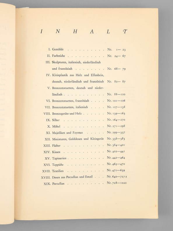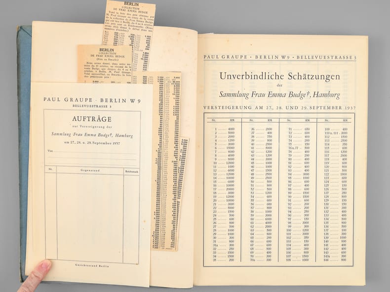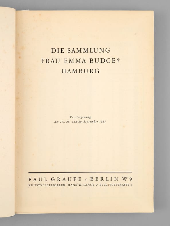 Nice copy. Included in this copy are the hammer prices (in Reichsmarks), most probably clipped from the French Newspaper La Gazette Drouot. This weekly publication was an remains an institution for tracking the auction market. Emma Ranette Budge (born Lazarus, 1852-1937) was a wealthy German Jewish philanthropist and art collector from Hamburg. Against the wishes of Emma Budge, her art collection was sold at auction in Germany, and the sale proceeds were confiscated by the Nazi regime.