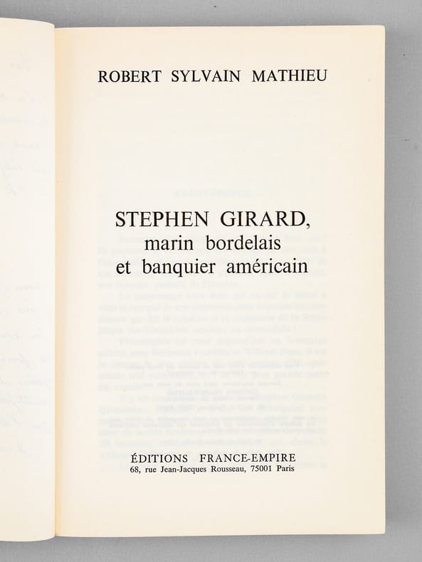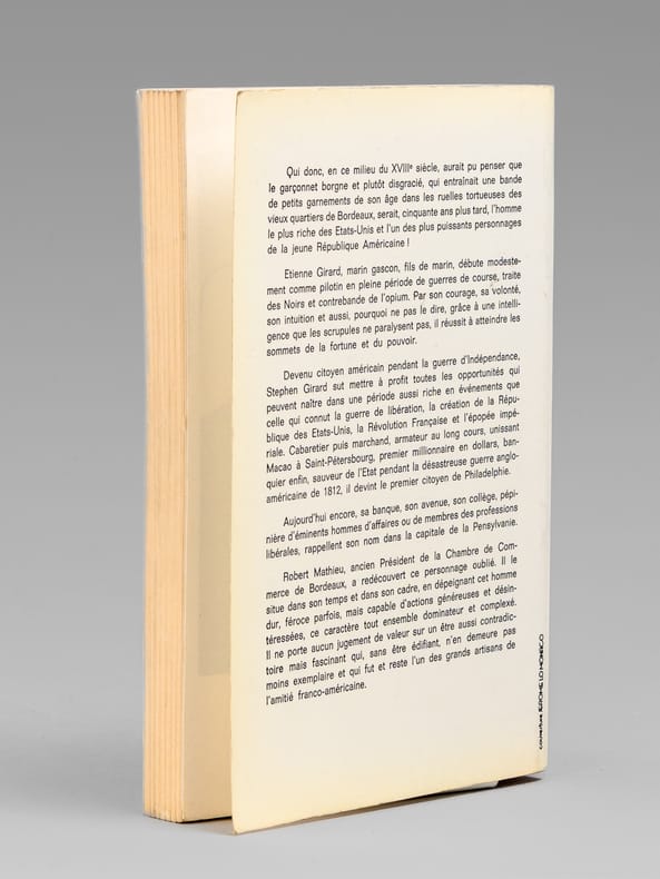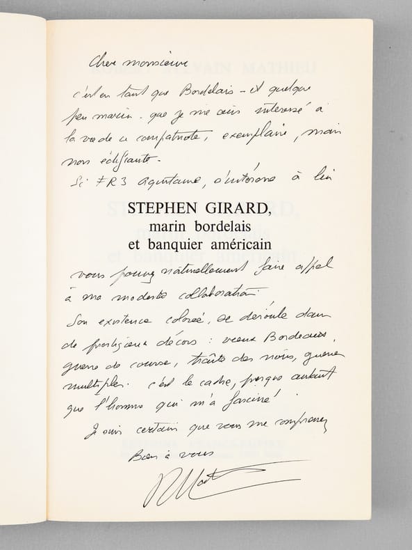 Bon état pour cet exemplaire avec un long envoi de l'auteur : "Cher Monsieur, Cher Monsieur c'est en tant que Bordelais et quelque peu marin que je me suis intéressé à la vie de ce compatriote exemplaire mais non édifiant Si FR3 Aquitaine s'intéresse à lui vous pouvez naturellement faire appel à ma modeste collaboration. Son existence colorée se déroule dans de prestigieux décors: Vieux Bordeaux, guerre de course, traite des Noirs, guerres multiples. C'est le cadre, presque autant que l'homme, qui m'a fasciné. Je suis certain que vous me comprenez point bien à vous.". Le dédicataire était un journaliste bordelais.