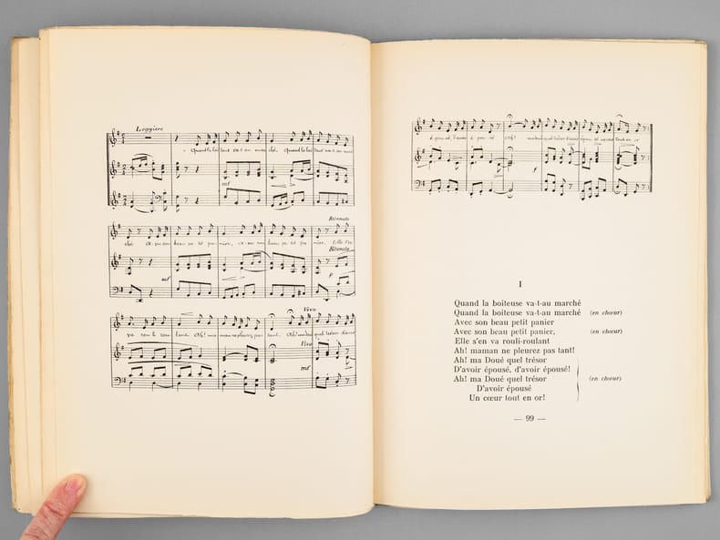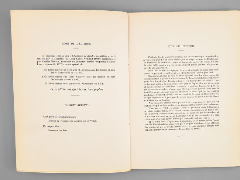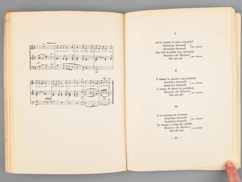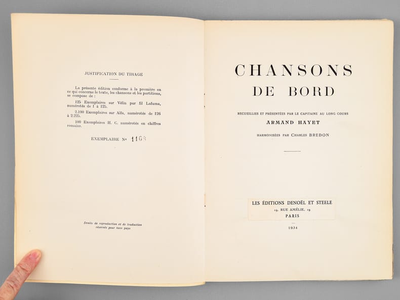 Chansons de bord recueillies et présentées par le capitaine au long cours Armand Hayet. Harmonisées par Charles Bredon et illustrées de quatorze dessins originaux d'André Lhote. (Paris: Editions Eos, 1927). [M.C.: chanson, marine]