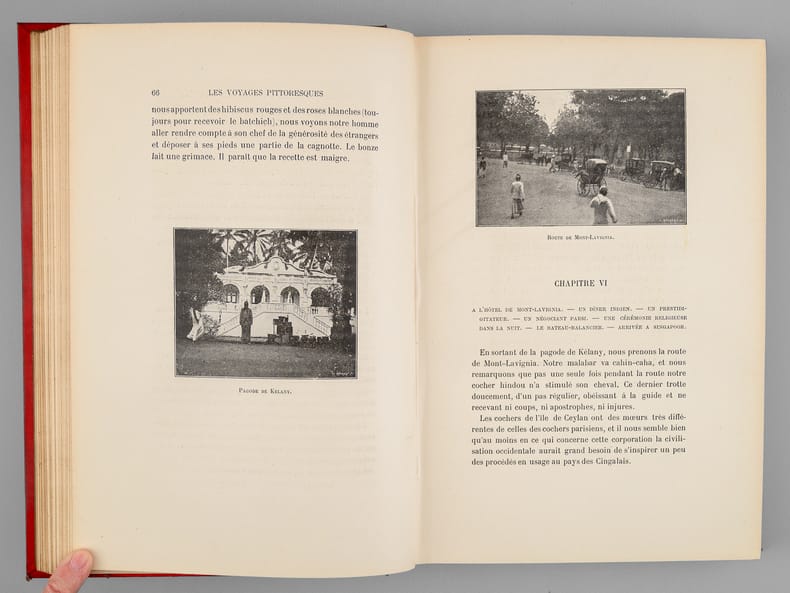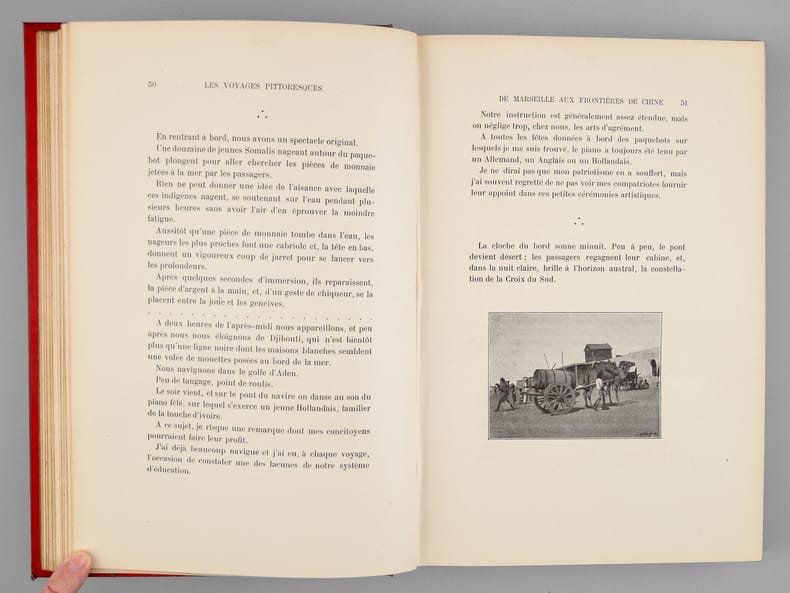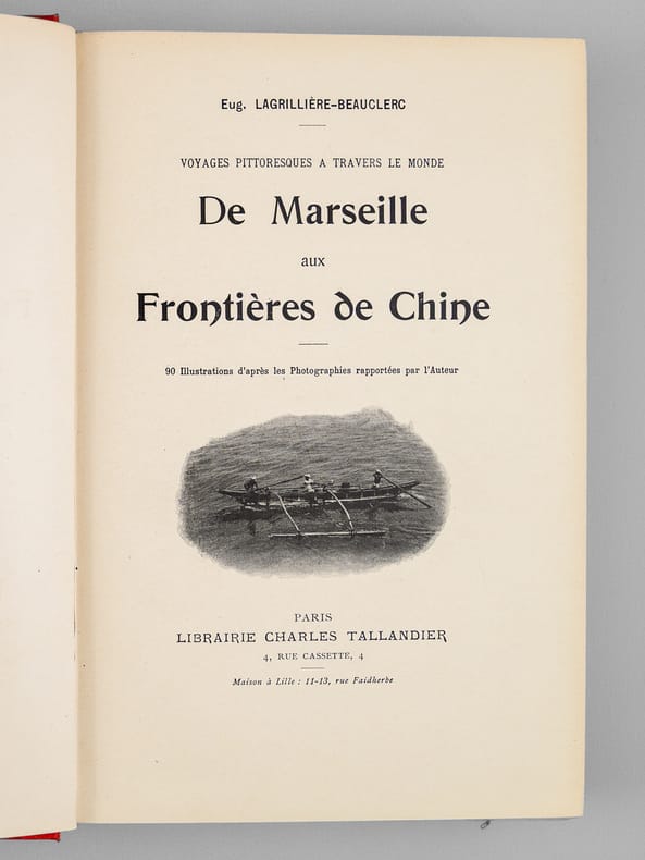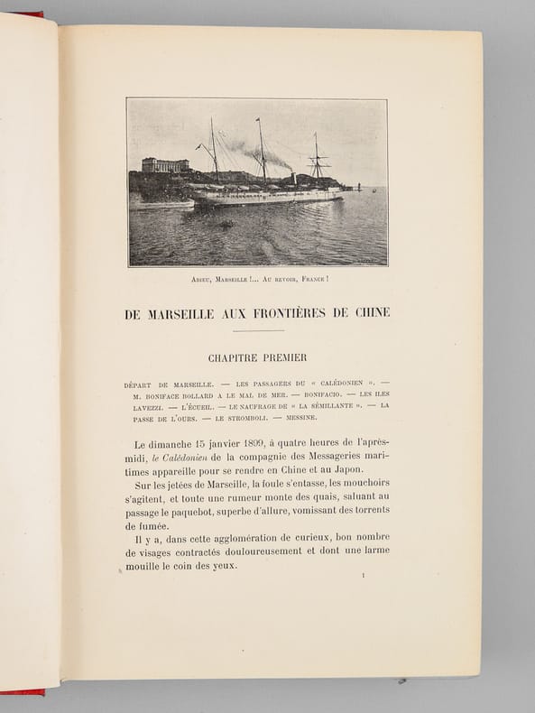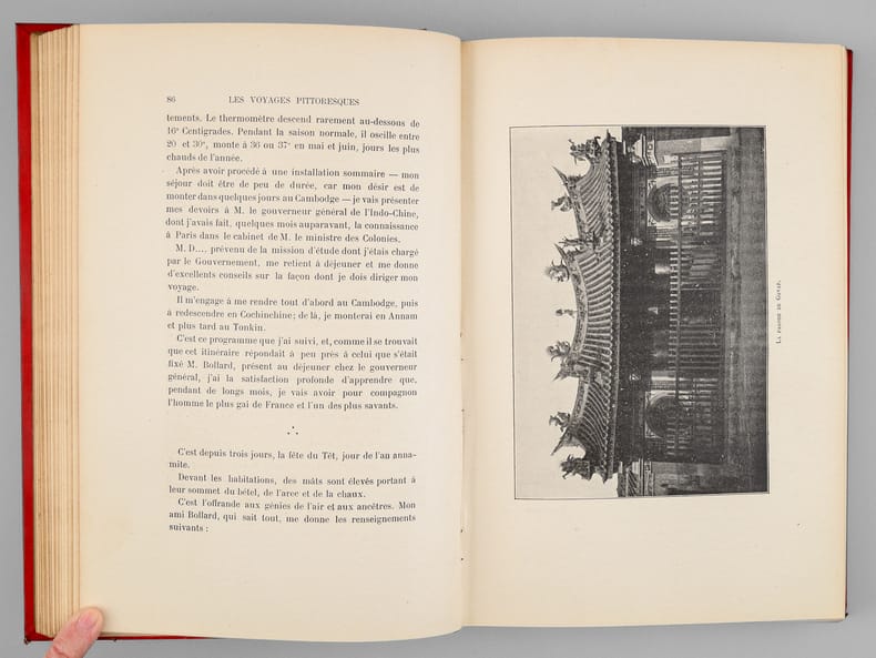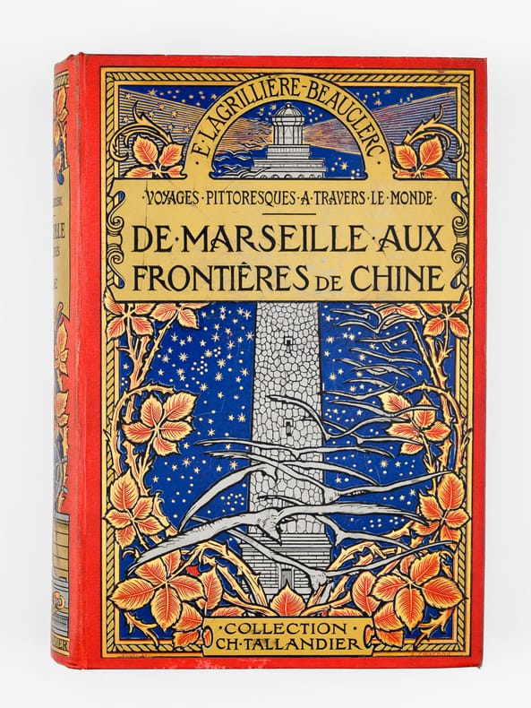 Bon exemplaire en très bon état, dans son superbe cartonnage polychrome (infimes frott. au cartonnage, ex-dono ancien au crayon en garde, très bel état par ailleurs). L'ouvrage décrit le voyage au départ de Marseille à bord du navire "Calédonien". Le voyage commence par une traversée de la Méditerranée (passage par Bonifacio et Messine), avant de franchir le canal de Suez pour rejoindre la mer Rouge. Après une escale à Djibouti et Colombo, l'auteur arrive à Singapour, puis à Saïgon, début de son exploration de l'Indochine française. Le voyage se concentre alors sur le Cambodge, avec des descriptions détaillées de Pnom-Penh et des ruines d'Angkor-la-Grande. Le texte évoque les rencontres avec la royauté locale, notamment le roi Norodom, mais détaille également les mœurs et remèdes traditionnels des populations cambodgiennes. On continue le voyage vers l'Annam (Tourane et Hué, où il est reçu en audience par l'empereur Thanh-Thay), puis vers le Tonkin et à la remontée du fleuve Rouge jusqu'au Yunnan, en Chine. On y croise les lieux emblématiques comme la baie d'Along, mais également les aspects plus sombres ou insolites du voyage : la piraterie, les supplices, les fumeries d'opium et la vie dans les auberges du Tonkin. Après des étapes à Hong-Kong et Canton, l'auteur évoque le pays des Moïs puis le récit se termine par le retour de l'expédition.