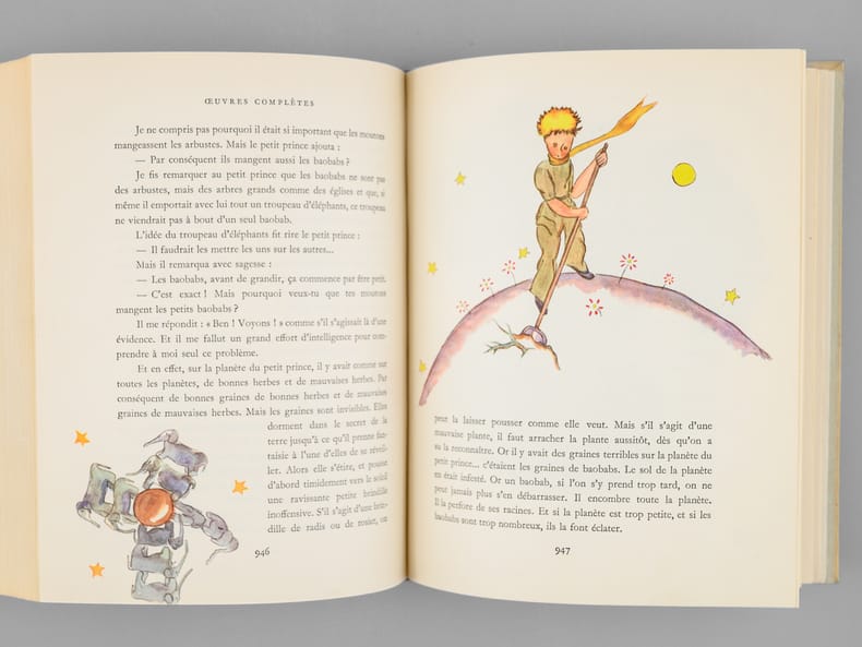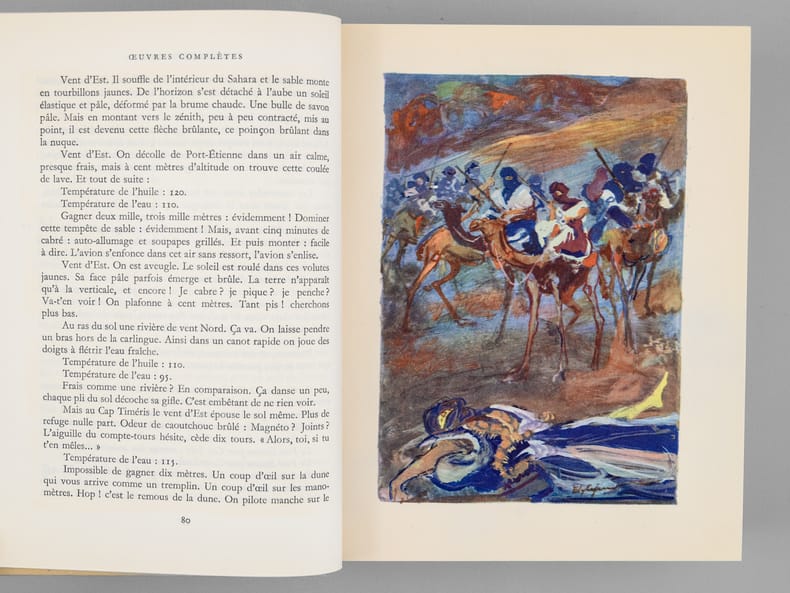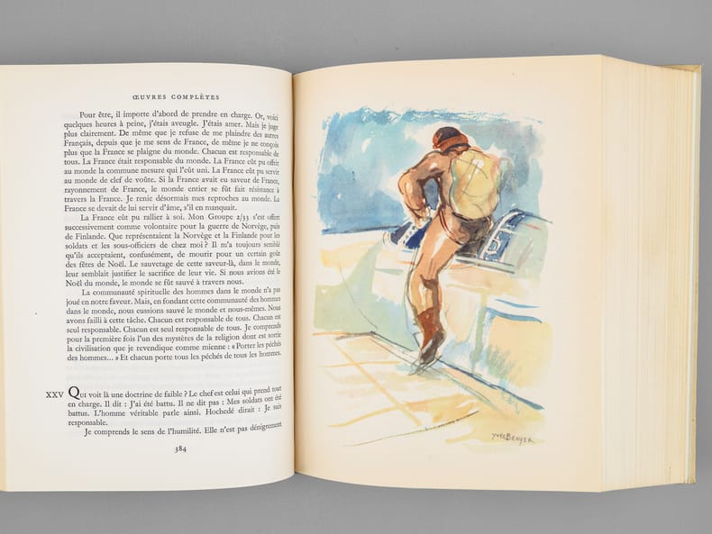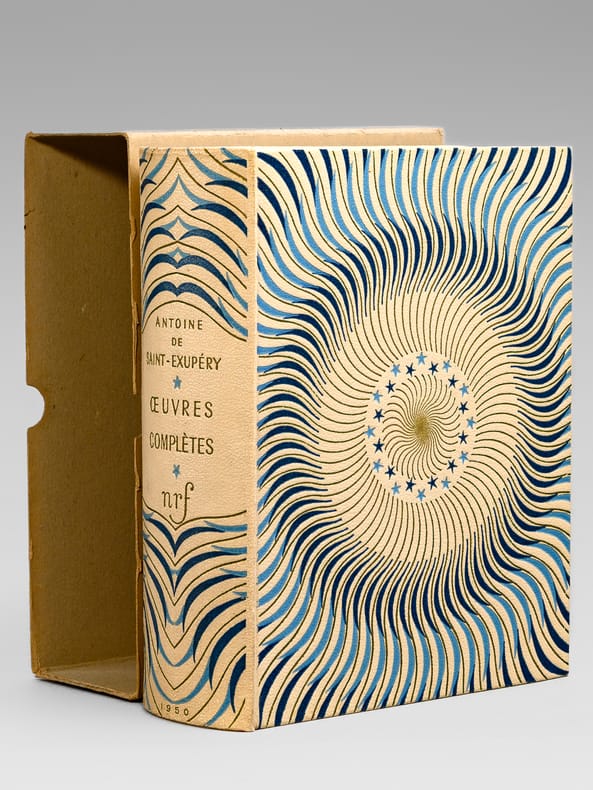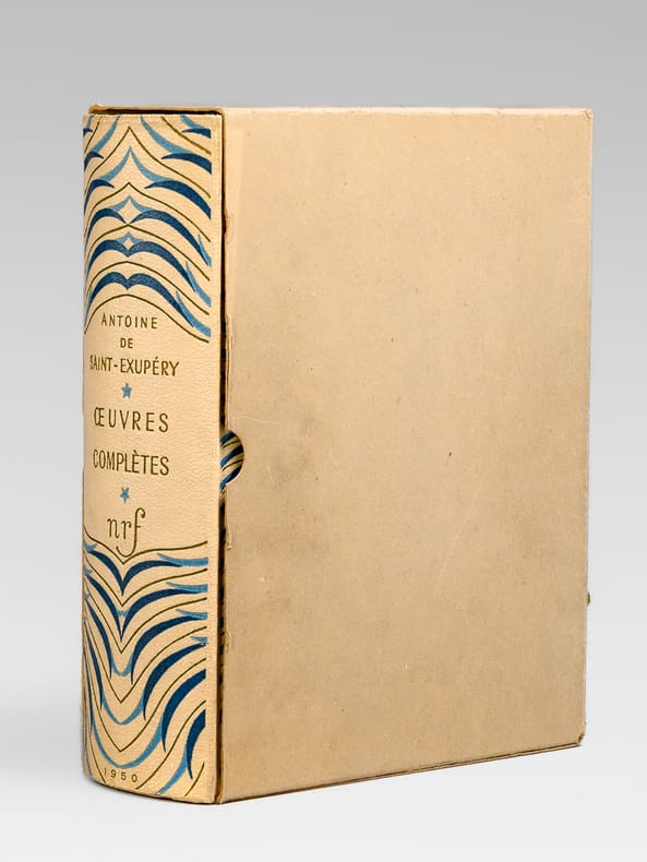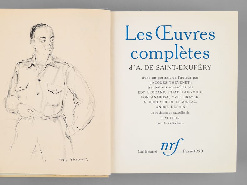 Avec un portrait de l'auteur par Jacques Thevenet ; trente-trois aquarelles par Edy Legrand, Chapelain-Midy, Fontanarosa, Yves Brayer, A. Dunoyer de Segonzac, André Derain ; et les dessins et aquarelles de l'auteur pour Le Petit Prince, tirage à 15350 exemplaires numérotés (n° 13097), 1 vol fort in-8 cartonnage éditeur d'après la maquette de Paul Bonet, sous étui cartonné, NRF, Gallimard, Paris, 1950