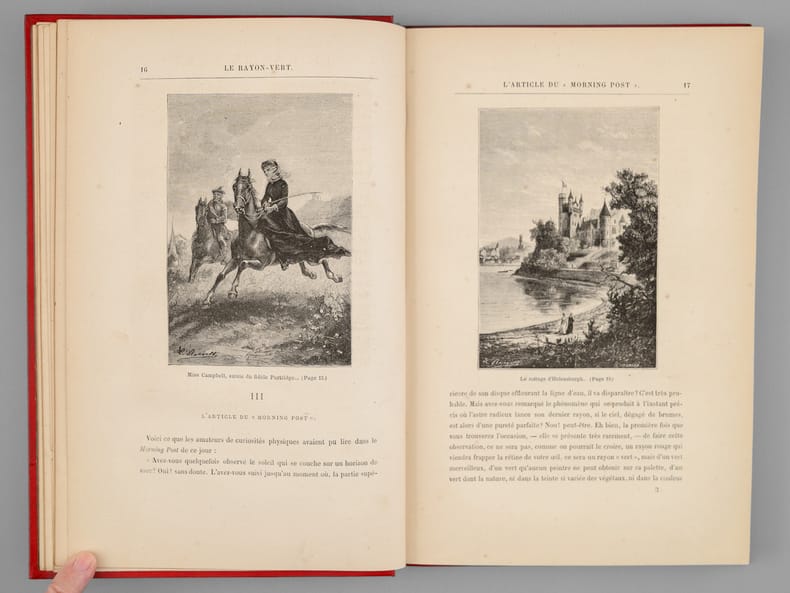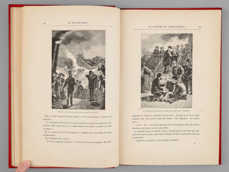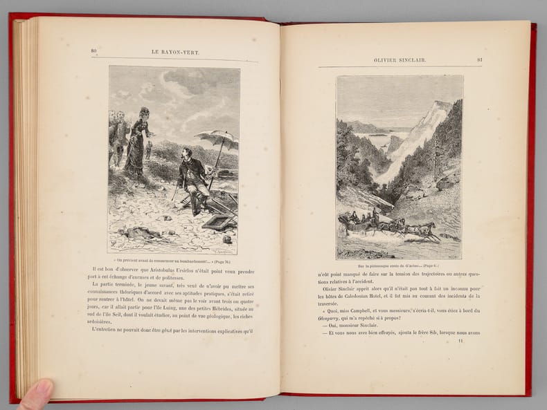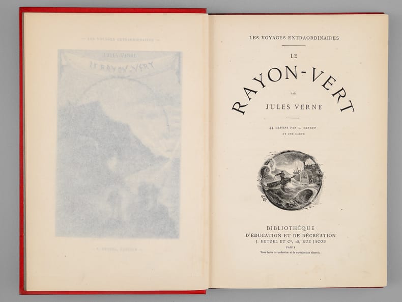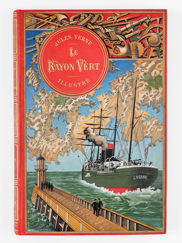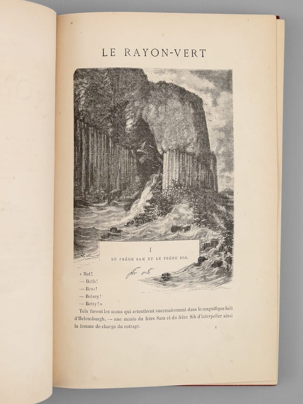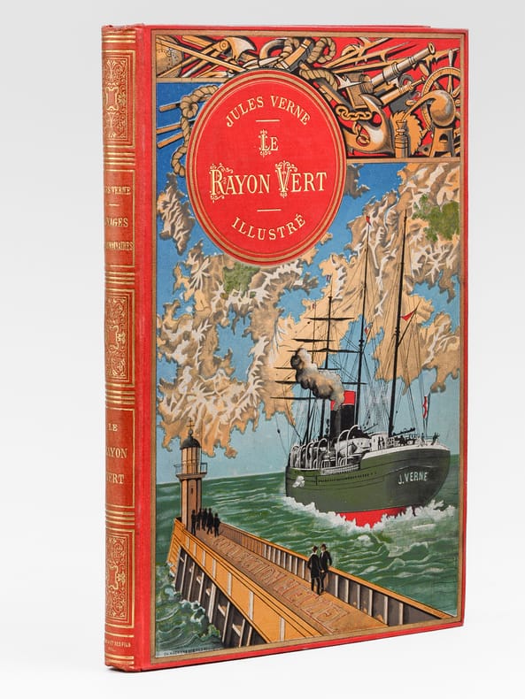 Collection les voyages extraordinaires Complet un volume, superbe reliure, tête dorée, signet, lettrines, culs-de-lampe reliure plein cuir, 21x14, ornées sur le dos de motifs dorés, très bon état, parfait état intérieur, 320 pages. Jean de Bonnot, 1978 Le Rayon Vert - Un billet de Loterie Le rayon vert - Tome 18 En Ecosse, une jeune orpheline veut gagner du temps pour éviter le triste mariage promis par ses vieux oncles. Elle va donc leur demander à voir le fameux rayon vert qui permet de percevoir sans erreur la réalité des sentiments. Sous le prétexte d’une intrigue amoureuse, la science triomphante et pédante est ridiculisée par la poésie et par l’art : subversif ! Dans le même volume, le numéro 009672 est-il gagnant ? : Un billet de loterie Alors que son fiancé est porté disparu au large de Terre Neuve, Hulda Hansen reçoit un message écrit juste avant le naufrage fatidique, accompagné d’un billet de loterie. Cette belle histoire attire les acheteurs persuadés que le billet est porteur de chance. Hulda devra se résoudre à le vendre, avant de retrouver l’amour et la richesse dans ce récit surprenant qui glorifie le hasard, contre toute raison.