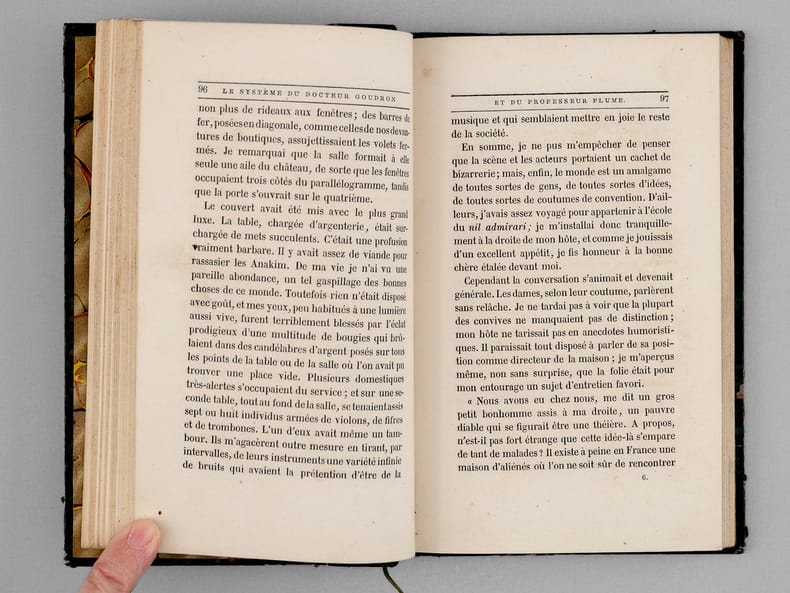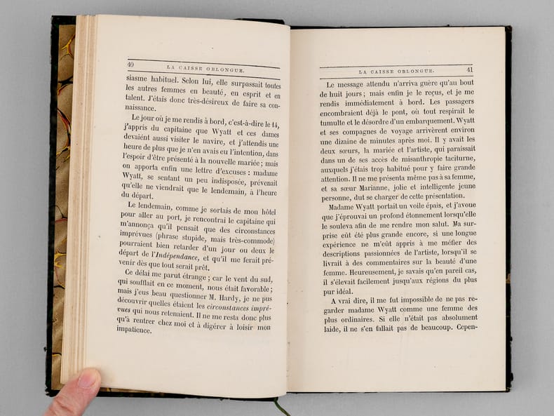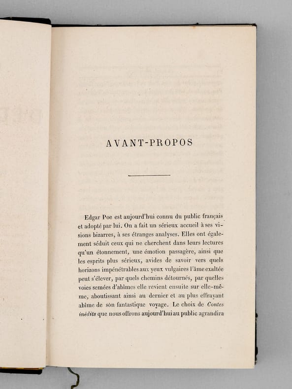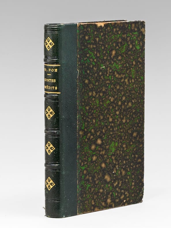 Rare exemplaire de l'édition originale de la traduction française, en jolie reliure d'époque. L'ouvrage contient les contes suivants : Le rendez-vous ; Éléonore ; La caisse oblongue ; Le cadavre accusateur ; Le système du docteur Goudron et du professeur Plume ; Un homme usé ; La semaine des trois dimanches ; Le sphinx ; Les lunettes ; Les débuts littéraires de Thingum Bob ; Politien. Et 9 poèmes (Ulalume ; Hélène ; El Dorado ; Le corbeau ; A ; La dormeuse ; Lénore ; Un rêve dans un rêve ; Pour Annette). Etat très satisfaisant (coupes frottées, infime frott. en dos, très bon état par ailleurs). Vicaire, VI, 737