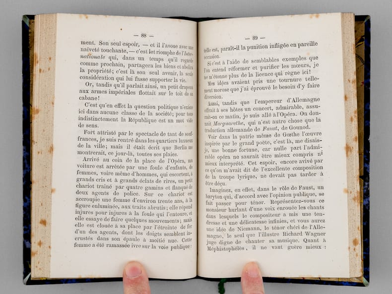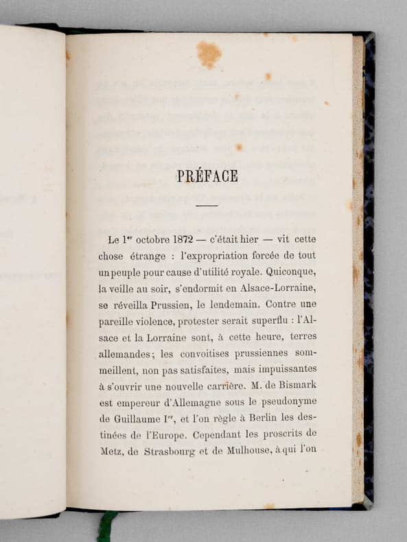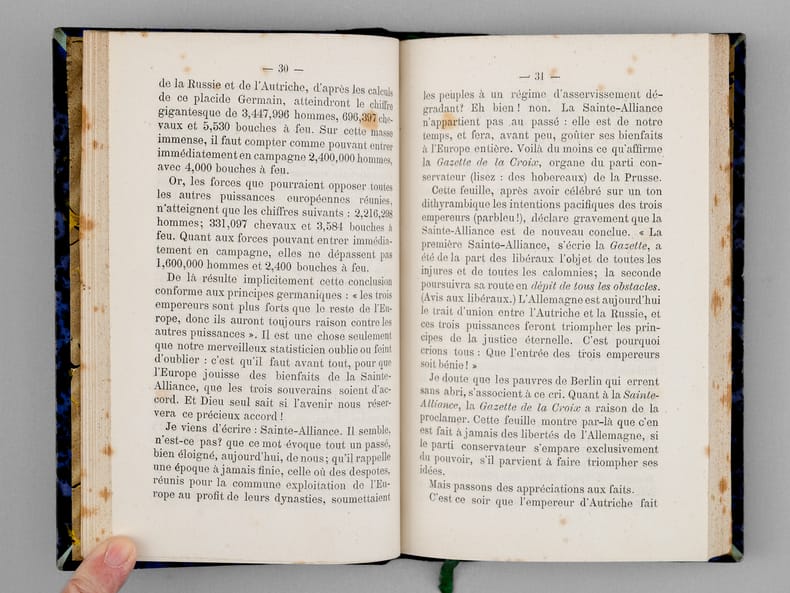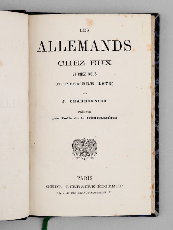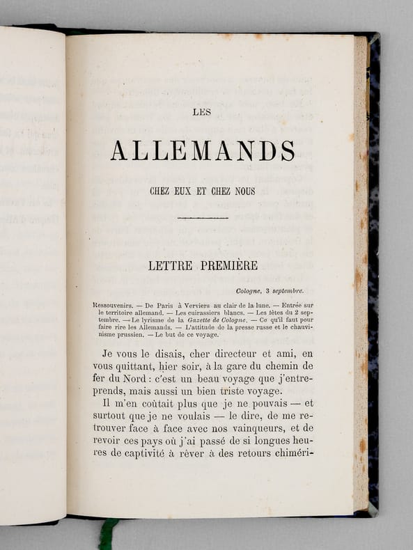 Ouvrage peu commun, rédigé au lendemain de la défaite de Sedan. Etat très satisfaisant (rouss., petit savetage sur qq. ff., très bon état par ailleurs) pour cet exemplaire très bien relié.