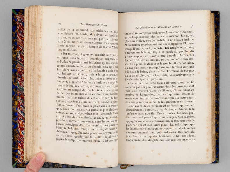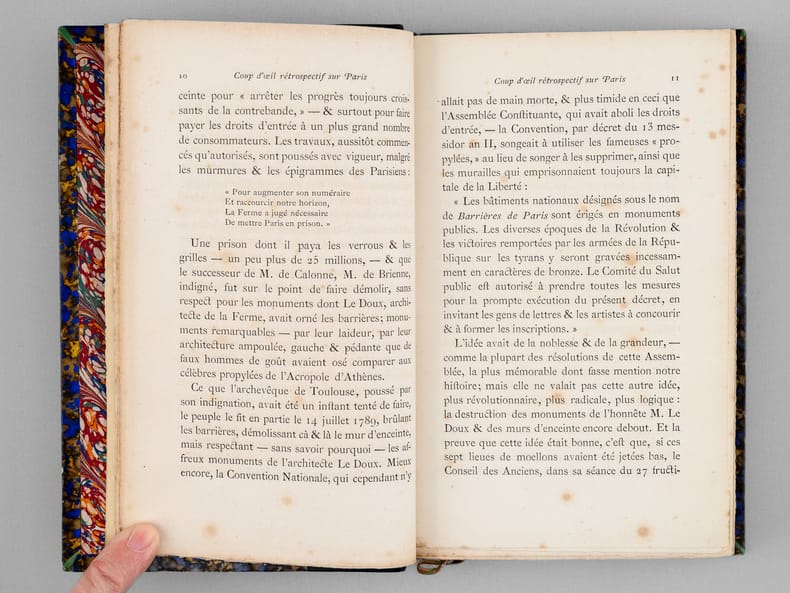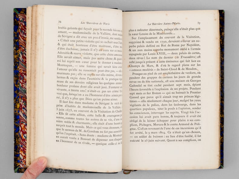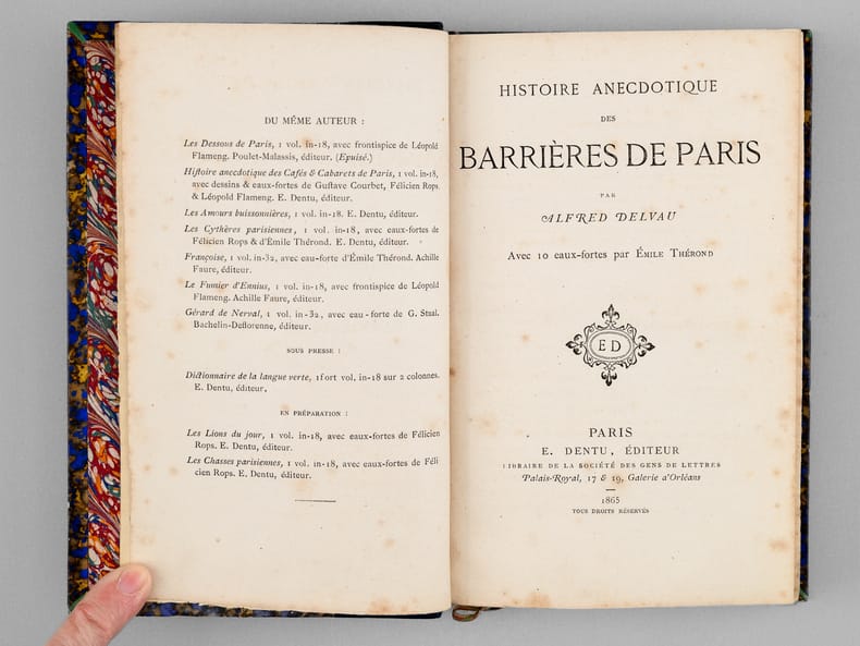 Les 10 eaux-fortes sont constituées de 10 vignettes tirées sur chine et contrecollées en tête de chapitres et représentent : La Barrière de Passy, la Barrière de l'Étoile, la Barrière de Clichy, les Barrières de la Villette et de Pantin, la Barrière de Belleville, la Barrière du Trône, la Barrière Saint Jacques, la Barrière d'Enfer, la Barrière de Montrouge, la Barrière du Maine. Bon état pour cet exemplaire bien relié (qq. rouss., discrète mouill. marginale en tête). Vicaire, III, 154