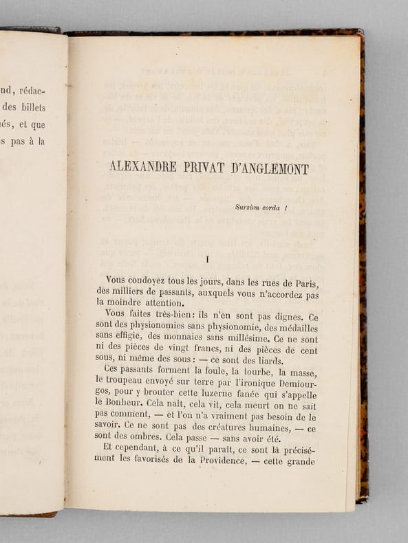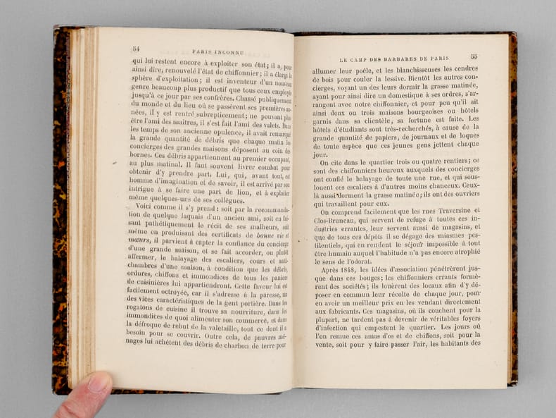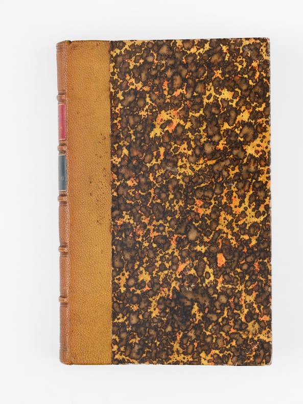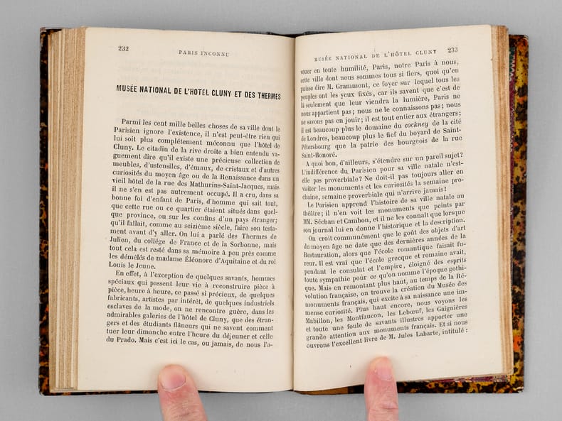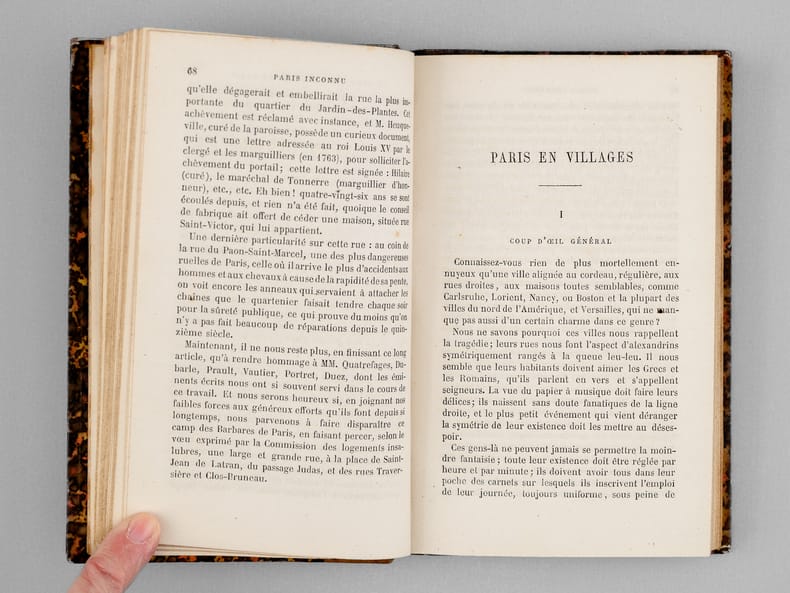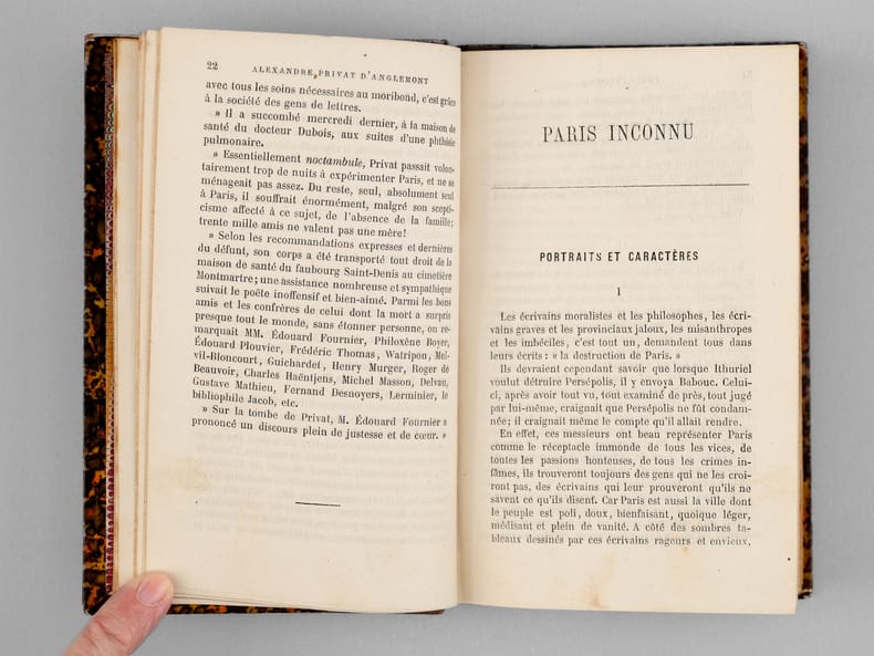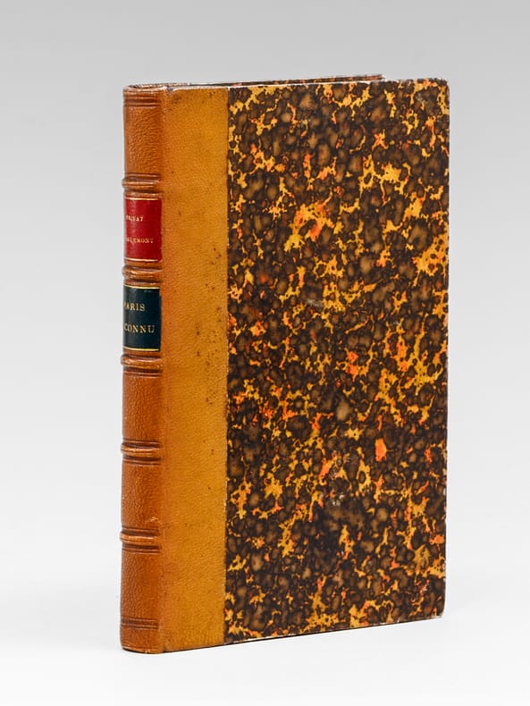 1 vol. in-12 reliure de l'époque demi-chagrin brun, dos à 5 nerfs, Adolphe Delahays, Paris, 1861, 283 pp. Rappel du titre complet : Paris Inconnu [ Edition originale] [ Contient : ] Portraits et caractères — Le Cloître Saint-Jean de Latran — Le Camp des barbares — Rues Traversine et Clos Bruneau — Paris en villages — Peintures d'histoire, portraits et paysages — Le Faubourg Saint-Jacques — L'Épicerie et le théâtre — La Légende de l'épicier, auteur dramatique — Un parfait épicier — Le Cultivateur en chambre — Esquisses parisiennes — Le Marché aux journaux — Les Crieurs (souvenirs de 1848) — Un Ami trop bon enfant — L'Œil sans paupières et la langue des On. — Nouvelles — Histoire d'une chemise — Les Singes de Dieu et les hommes du diable — Théâtre — M. Poupard — Articles divers — Lettres — Poésies.