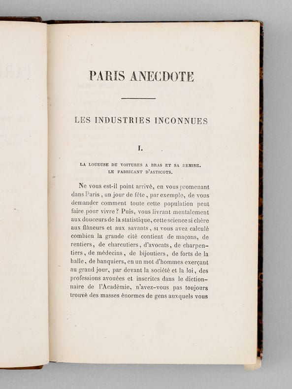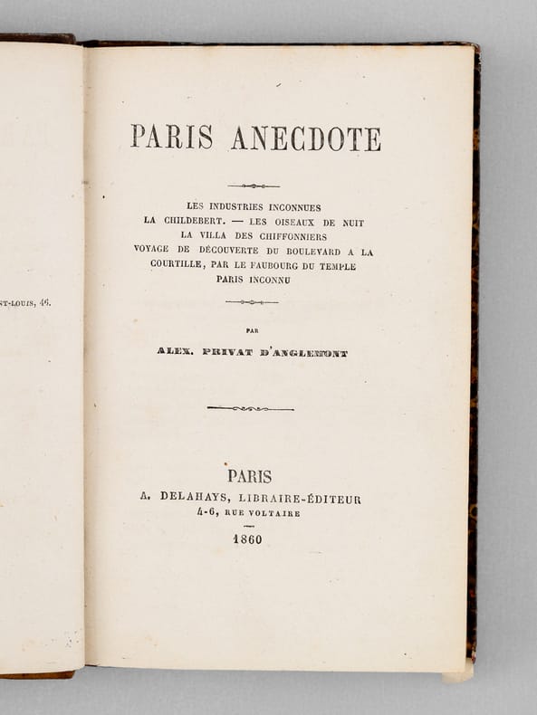 1 vol. in-12 reliure de l'époque demi-chagrin brun, dos à 5 nerfs, Adolphe Delahays, Paris, 1860, 2 ff., 343 pp. Rappel du titre complet : Paris Anecdote [ Contient : ] Les industries inconnues - La Childebert - Les oiseaux de nuit - La villa des chiffonniers - Voyage de découverte, du boulevard à la Courtille, par le faubourg du Temple - Paris inconnu. ]