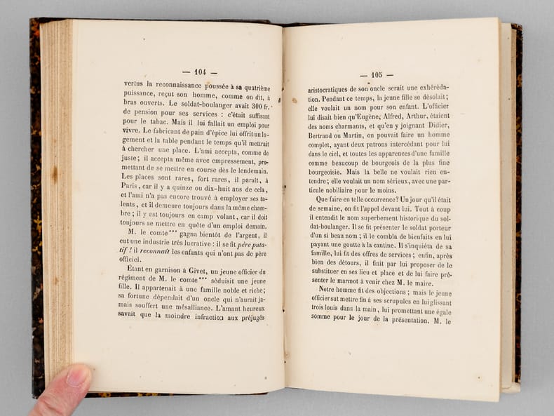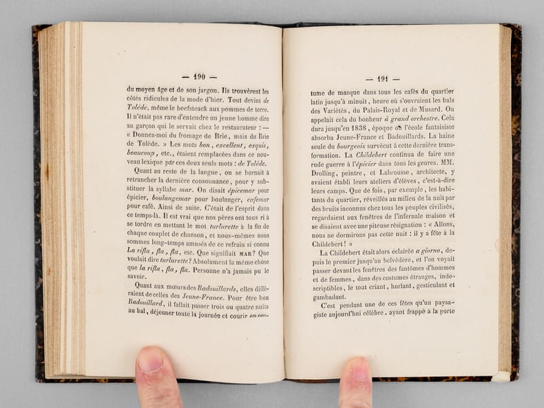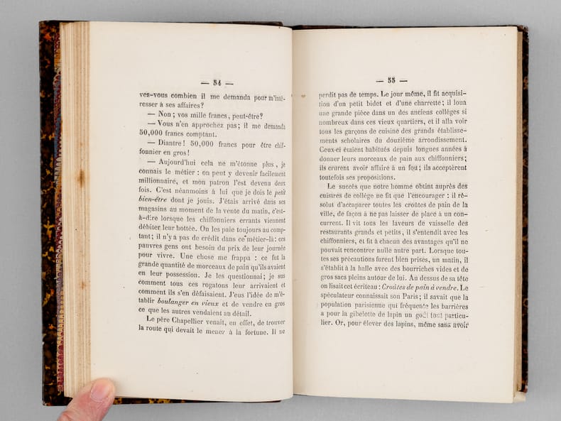 Bon état (qq. rouss.) pour cet exemplaire bien relié. Vicaire, VI, 830 ; Lacombe, 976 qui détaille le contenu : "la loueuse de voitures à bras et sa remise ; Artistes populaires ; Le boulanger en vieux ; Le pâtissier ambulant ; La fabrique de café à deux sous la tasse ; Le fabricant de crètes de coq ; La loueuse de sangsues ; Le professeur d'oiseaux , etc. ; La Childebert : c'etait le nom d'une maison située rue Childebert, maison dans laquelle habitaient des artistes ; description pittoresque. Les oiseaux de nuit cabarets des environs des Halles ; Villa des chiffonniers Cité Doré au faubourg ; Saint - Marceau ; Voyage bals publics ; lord Seymour ; Paris inconnu les chiffonniers . (Ce dernier chapitre est différent de l'ouvrage portant ce nom)