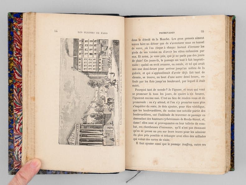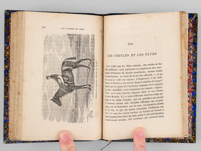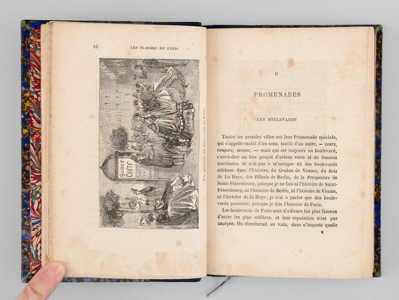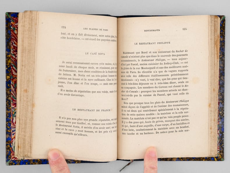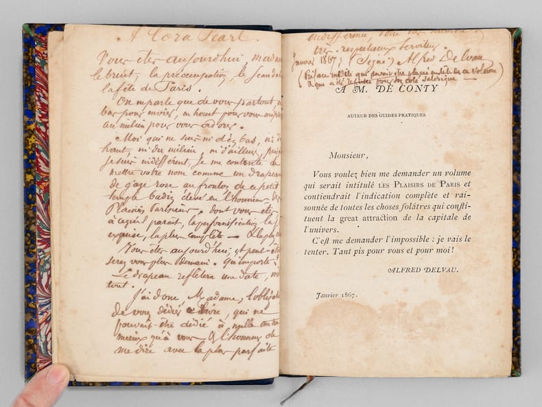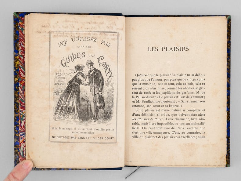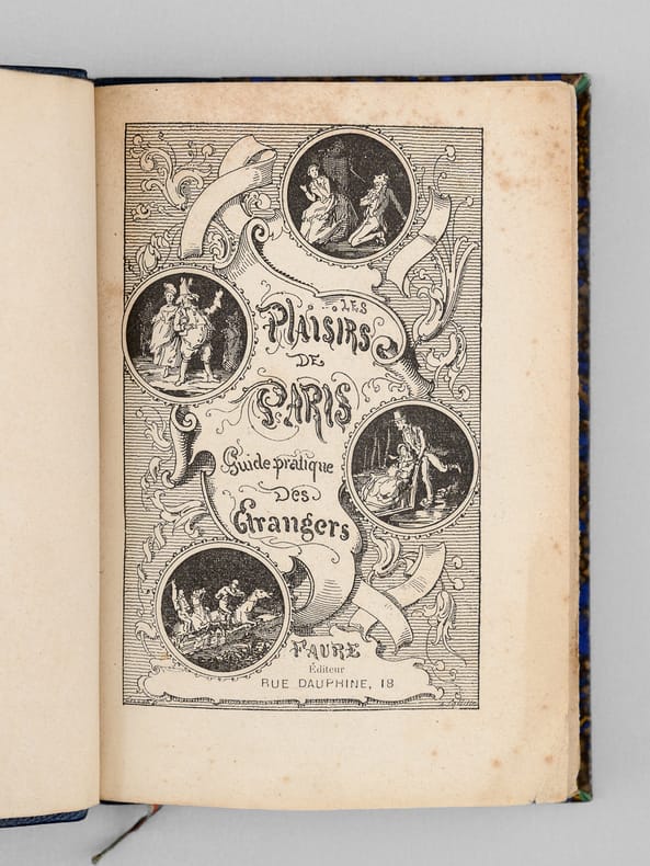 Une main anonyme mais contemporaine de l'ouvrage a reproduit, au verso du feuillet de titre, le texte de la "préface inédite qui devait être placée en tête de ce volume & qui a été refusée pour son côté satirique" : "À Cora Pearl, Vous êtes aujourd'hui, madame, le bruit, la préoccupation, le scandale, la fête de Paris. On ne parle que de vous partout, en bas pour envie, en haut pour vous mépriser, au milieu pour vous adorer. Moi qui ne suis ni d'en bas, ni d'en haut, ni du milieu, ni d'ailleurs, puisque je suis indifférent, je me contente de mettre votre nom comme un drapeau de gaze rose au fronton de ce petit temple badin élevé en l'honneur des plaisirs parisiens, dont vous êtes, à ce qu'il paraît, la personnification la plus exquise, la plus complète. — Hélas ! Vous êtes aujourd'hui, et peut-être serez-vous plus demain. Qu'importe ? Le drapeau reflétera une date, voilà tout [ ... ]". Vicaire, Gastr., 265 ("Nombreuses notes humoristiques sur les cafés et les restaurants de Paris, depuis les cabarets les plus à la mode jusqu'aux tables d'hôtes les plus modestes.") ; Lacombe, 1149 ("Ce volume semble, par son titre, devoir rentrer dans la série des Guides - Cicerones, mais il est mieux placé ici parce qu'il n'est en somme qu'un tableau moral ou immoral, comme on voudra - « de toutes les choses folâtres qui constituent la great attraction de la capitale de l'univers » [ ... ]). Bon état