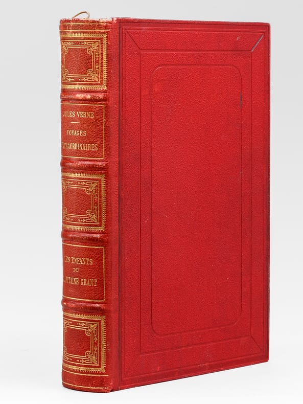 Editions Librairie Hachette / Collection Hetzel / Les Voyages Extraordinaires 1923. In-4 reliure éditeur pleine toile rouge de 620 pages au format 18,5 x 4 x 28 cm. Premier plat à l'éléphant avec " Voyages Extraordinaires par Jules Verne " inscrit dans l'éventail. Titre doré entouré de deux illustrations dorées ( Ballon et Ours ), insérées dans un cadre bordé de noir. Belles décorations aux fers dorés. Elégantes fleurs en noir. Dos au phare, avec petits tassements en haut et en bas. Tête dorée. A noter l'extrème fraicheur des dorures, ce qui est très rare pour les volumes publiés à cette date. Minuscules frottis et tassements aux coins. Intérieur frais, proche du parfait. Volume qui contient le roman " Les Enfants du Capitaine Grant. Voyage autour du Monde " avec des illustrations en noir par Edouard Riou, gravées par Pannemaker. Réédition. Rare exemplaire dans un tel état de fraicheur. Peu courant aussi frais.
