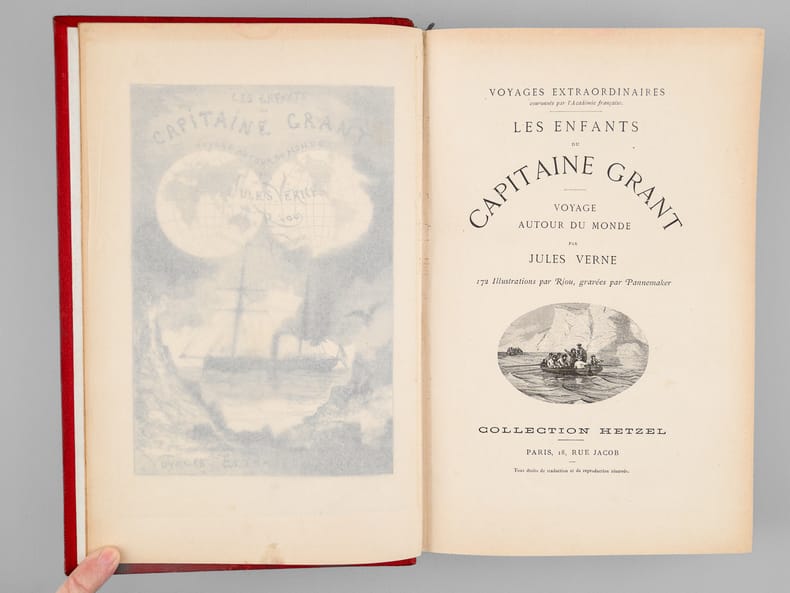 1885 1885 un volume, relié cartonnage polychrome rouge "à la bannière bleue" grand in-octavo éditeur (275x180mm), toutes tranches dorées, (cartonnage "lenègre" du 7ème Type, suppressions des hachures noires en haut de la bannière, mention "Collection Hetzel" en bas de la bannière, plat Bizeauté, 2ème plat : macaron circulaire sur fond noir), dos trés légèrement insolé, premier plat signé "Souze", bord bizeauté, pages de garde bleu-gris, orné de 172 vignettes par Riou, gravées par Pannemaker, légères rousseurs habituelles, 624 pages , sans date (1885-1894) Paris Bibliothèque D'éducation et De Récréation Jules Hetzel et Cie Editeur,??Imprimé par Gauthier-Villars,..............................Collection :"Les voyages extraordinaires.."...........