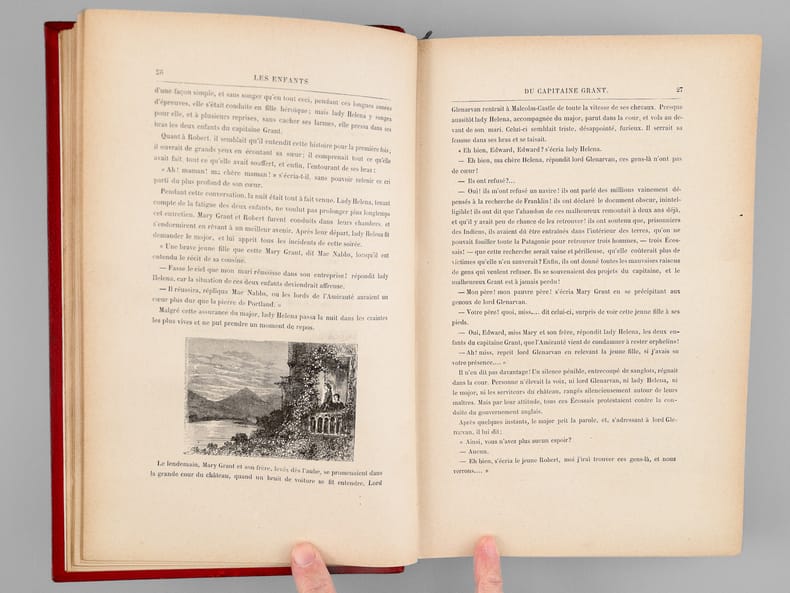 1 vol. fort in-4 reliure demi-basane marron, dos à 5 nerfs dorés, Bibliothèque d'Education et de Récréation, J. Hetzel et Cie, Paris, s.d., 624-211 pp. puis Gaspar Editores, Madrid, 1880 et 1882, 28-69 pp.Rappel du titre complet : Les Enfants du Capitaine Grant. Voyage autour du Monde [ Avec : ] Le Docteur Ox. Maître Zacharius. Un hivernage dans les glaces. Un drame dans les airs [ Avec : ] Los Amotinados de la Bounty. Un drama en Méjico [ Avec : ] Las Indias Negras.