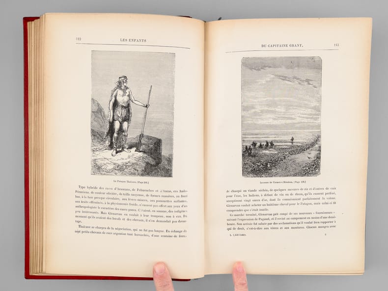 Illustrés de 172 vignettes par Riou, gravées par Pannemaker, 1 vol. in-8 reliure de l'époque demi-chagrin rouge dite « aux fers de lance » (ou « harpons » ou "reliure à la lancette"), dos à 4 nerfs orné, toutes tranches dorées, reliure signée de Engel, Collection Hetzel, Paris, s.d., 620 pp.