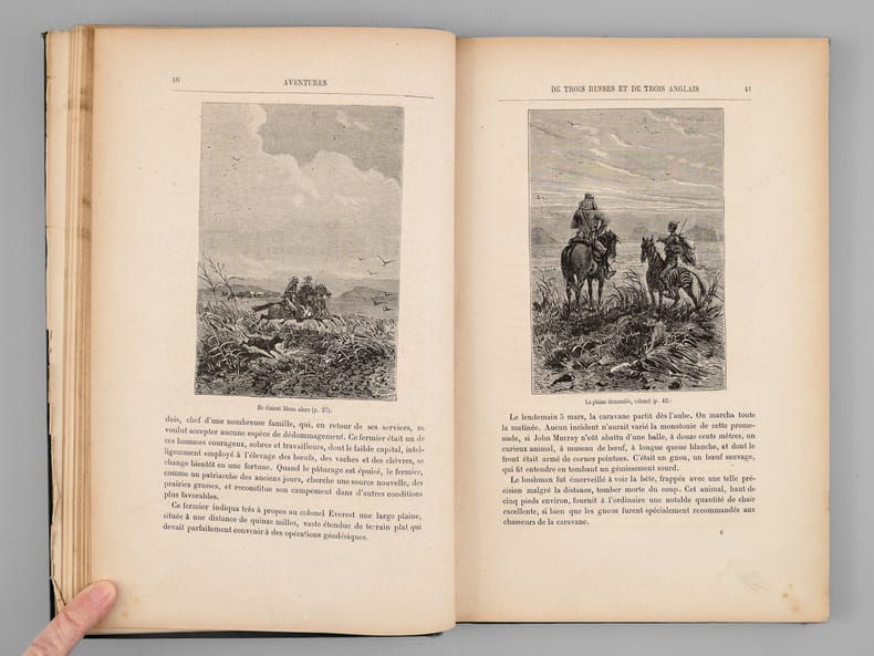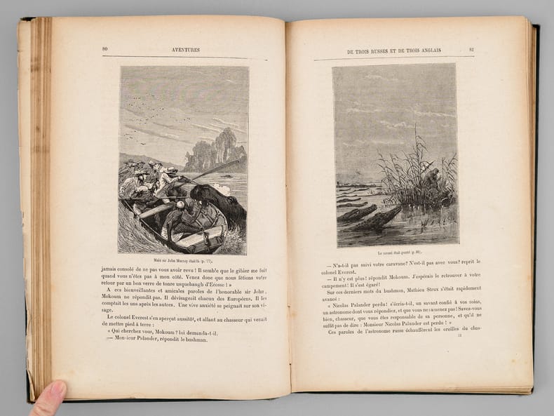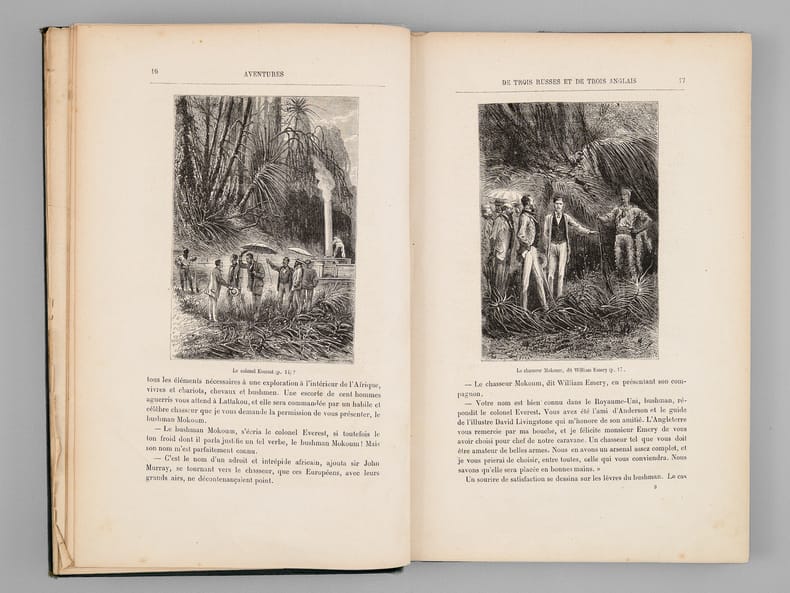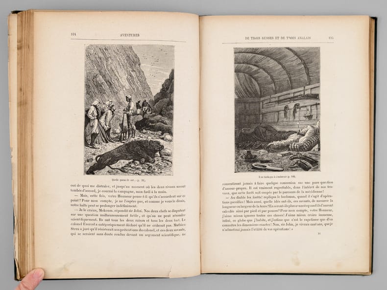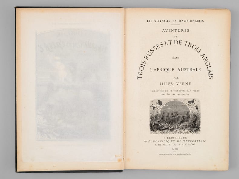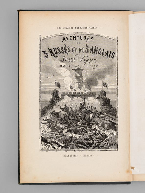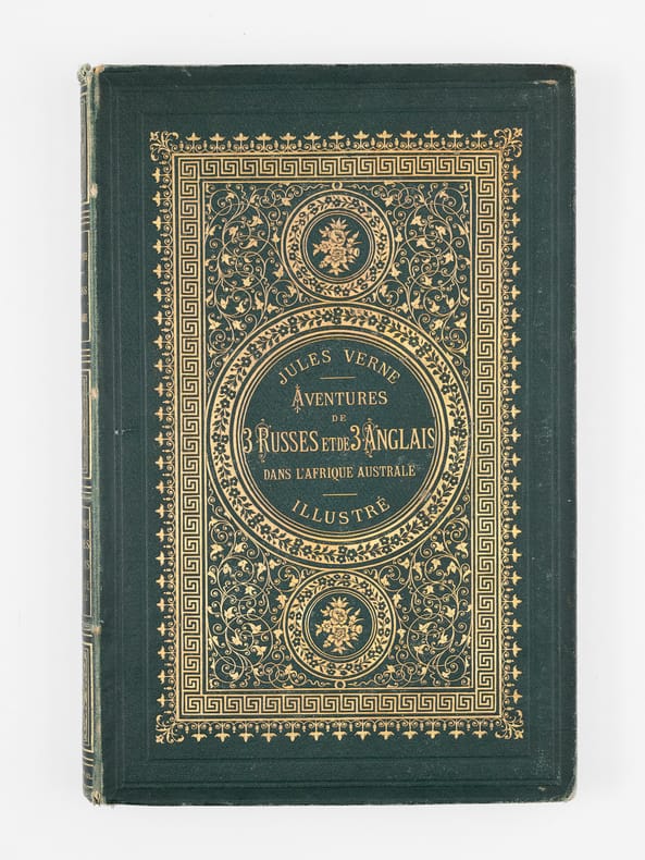 Illustrés de 53 vignettes par Ferat, gravées par Pannemaker, 1 vol. in-8 cartonnage éditeur vert aux bouquets de roses simple, toutes tranches dorées, reliure signée de Ch. Magnier, coll. Les Voyages Extraordinaires, Bibliothèque d'Education et de récréation, J. Hetzel et Cie, Paris, s.d. [ 1872 ], 2 ff., 202 pp. et 1 f. n. ch.