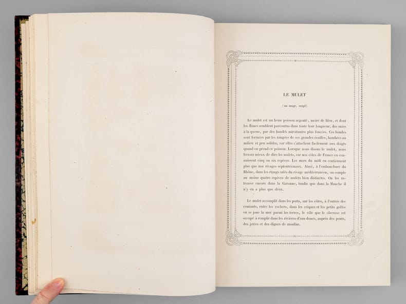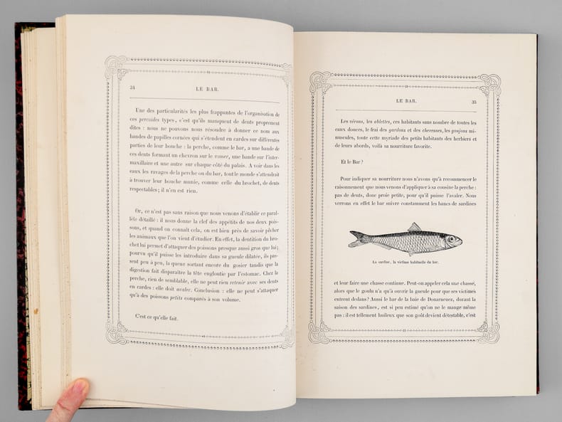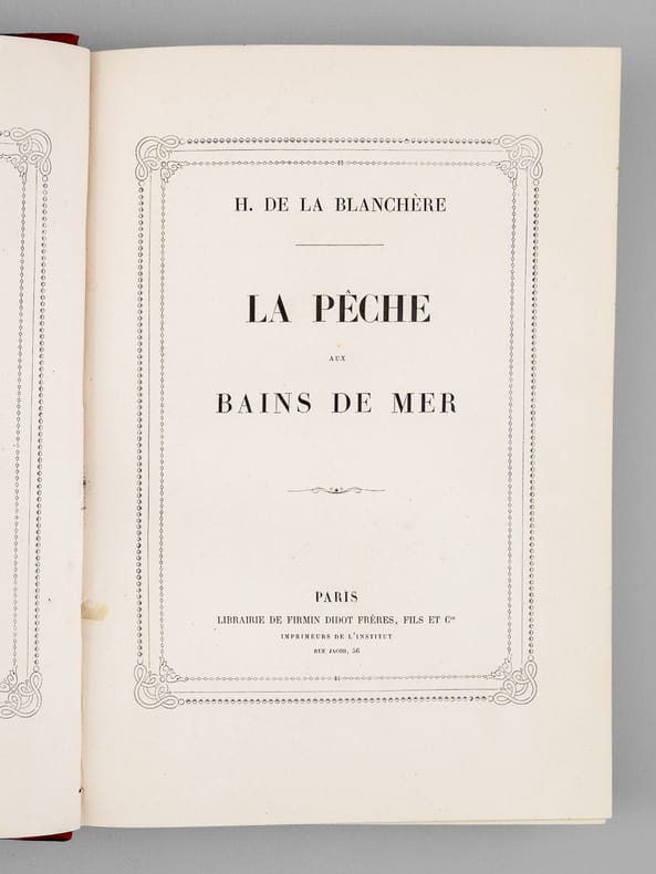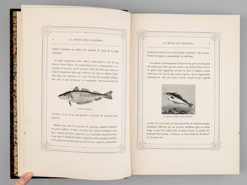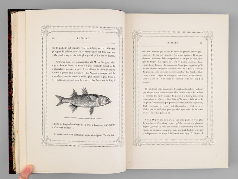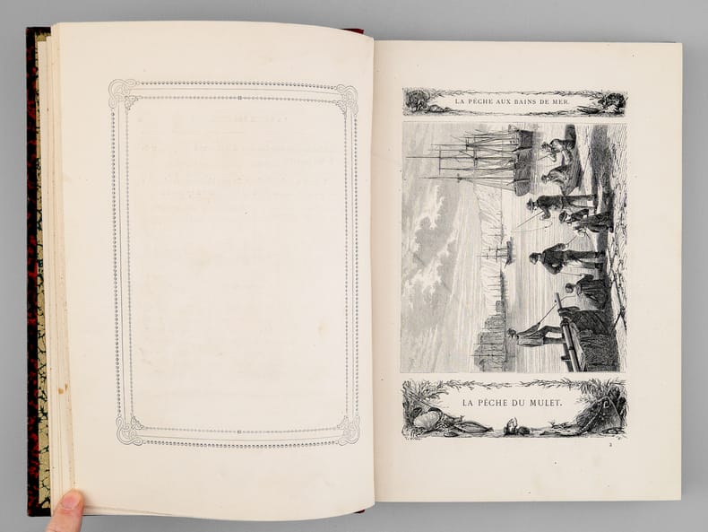 Firmin Didot fFrères, Fils et Cie 1890 In-4 20 x 28 cm. Reliure demi-chagrin noir, dos à 5 nerfs, orné de motifs floraux dorés, auteur et titre dorés, 291 pp., texte encadré, 20 planches hors-texte, gravures sur bois de poissons, crustacés et coquillages dans le texte. Bel exemplaire avec intérieur très frais. Toutes les techniques de pêche, de la pêche des officiers à la maraude sur la plage.