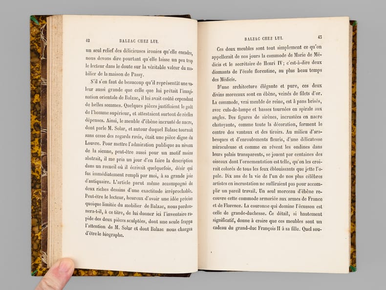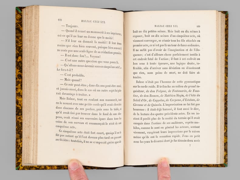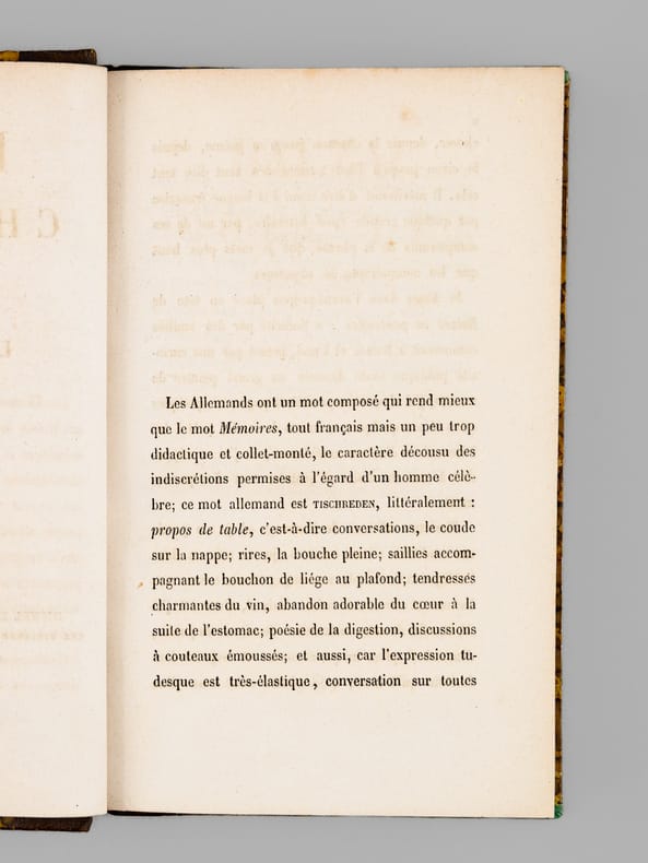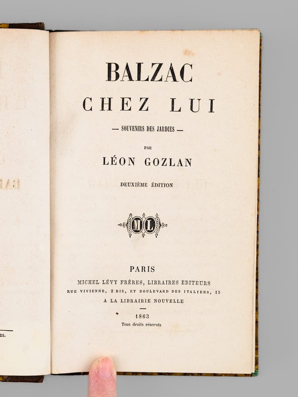 Paris Michel Lévy Frères, Libraires Editeurs 1862 in 12 (19x12,5) 1 volume reliure à la bradel de percaline rouge, dos lisse orné d'un fleuron doré, date en pied, pièce de titre de cuir vert, III et 302 pages, entièrement non rogné, article de presse ancien inséré in fine, quelques rousseurs éparses. Reliure signée de J. Gilg. De la Bibliothèque d'Alfred Piat avec son ex-libris doré renfermant ses initiales mêlées sur le plat supérieur, et portant la devise: Libro liber (La bibliothèque du notaire parisien Alfred Piat, fut proposée à la vente à Drouot du 31 janvier au 5 février 1898). Lèon Gozlan, Marseille 1803 - Paris 1866, écrivain français. Bel exemplaire ( Photographies sur demande / We can send pictures of this book on simple request )