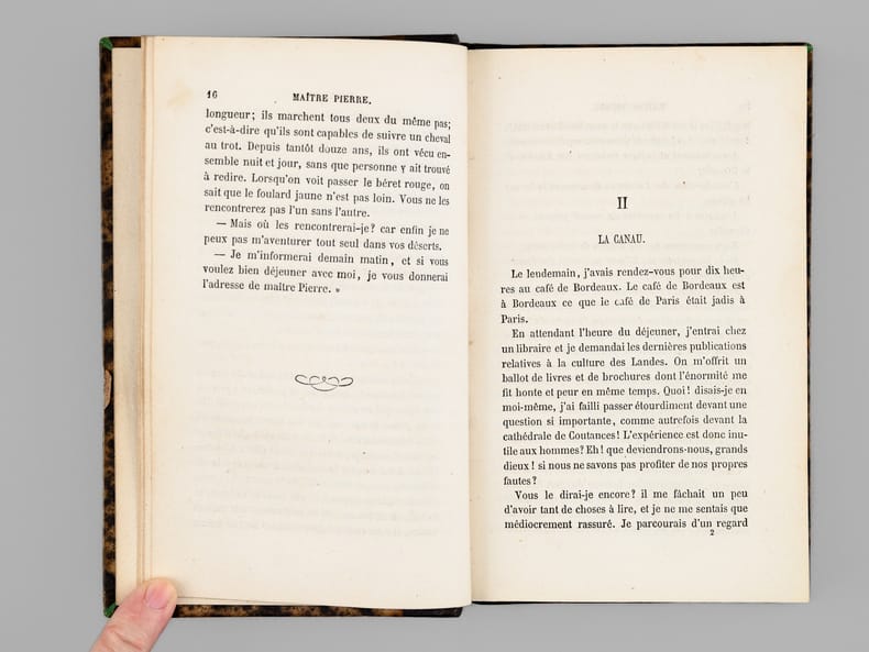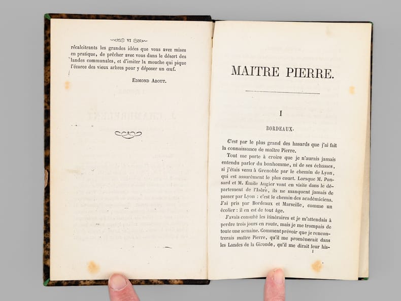 Sous forme romancée, l'ouvrage d'Edmond About est une ballade à Bordeaux et dans les landes girondines, sous la direction du meilleur guide : Maître Pierre. About évoque Bordeaux, Lacanau ("La Canau"), les landes, la pellagre, les dunes, se promène bateau "sur l'herbe" et termine son voyage sur le bassin d'Arcachon. Bon état