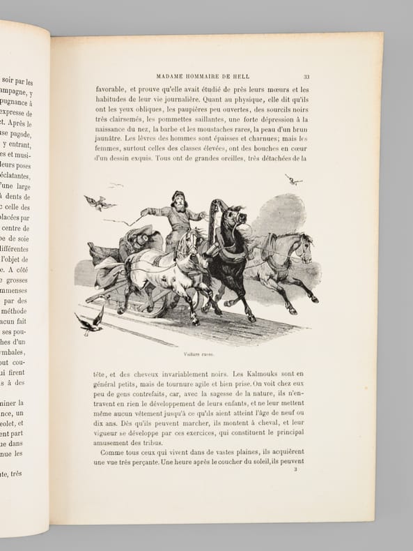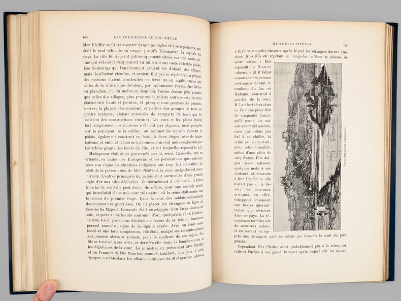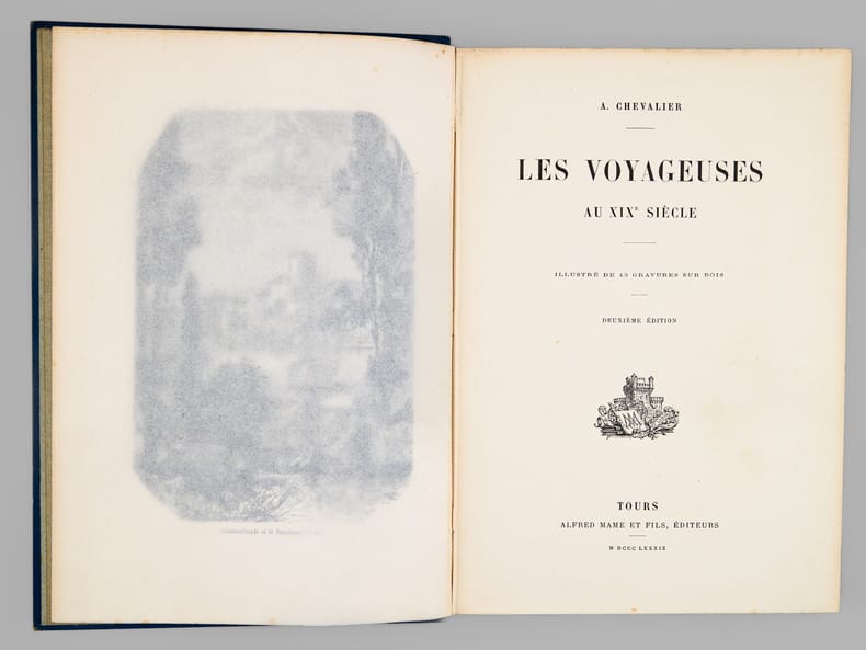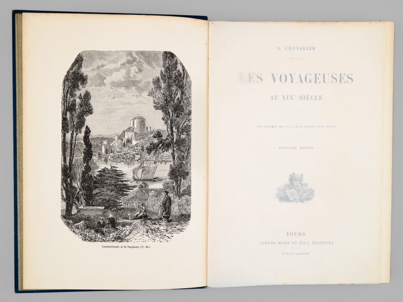 Deuxième édition, 1 vol. grand in-8 cartonnage éditeur pleine percaline bleue, premier plat polychrome, toutes tranches dorées, Alfred Mame et Fils, Tours, 1889, 285 pp. [ Contient : ] Lady Hester Stanhope - Madame Hommaire de Hell - Madame Léonie d'Aunet - Madame Ida Pfeiffer - Princesse Belgiojoso - Comtesse Dora d'Istria - Frédérika Bremer - Madame de Bourboulon - Mademoiselle Alexina Tinné - Lady Brassey - Les voyageuses d'aujourd'hui : Madame d'Ufjalvy-Bourdon - Madame Carla Serena - Les voyageuses anglaises