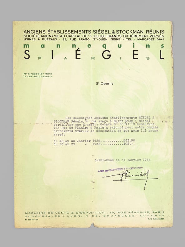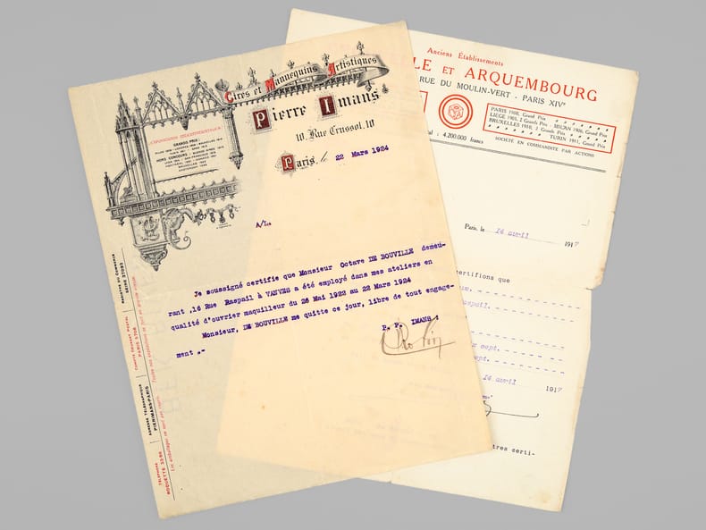 Intéressant dossier d'archives privées d'un dessinateur et décorateur ardennais, Octave de Bouville (Né à Neuvizy en 1899 - mort à Belâbre en 1974), passé par les écoles Germain Pilon et Bernard Palissy, et qui travailla notamment à l'emploi peu commun de "maquilleur au Service des Bustes en cire" pour la firme de mannequins Imans.