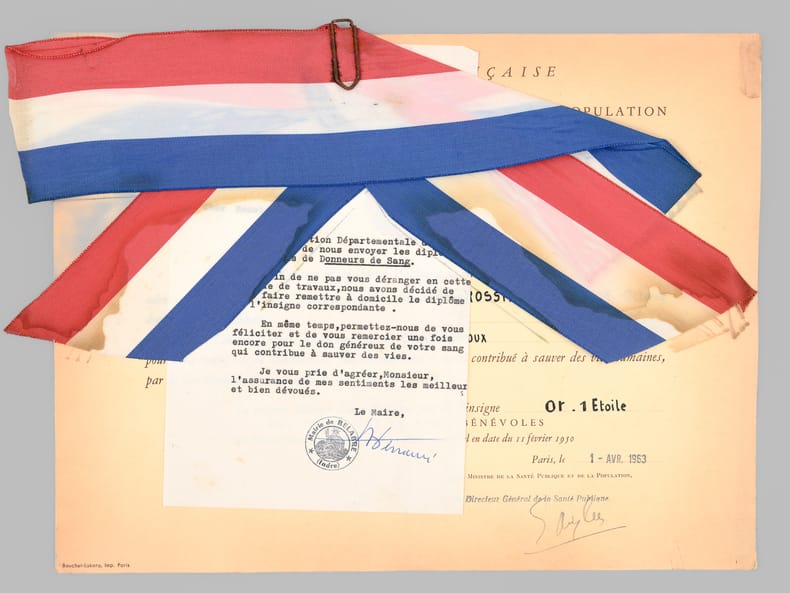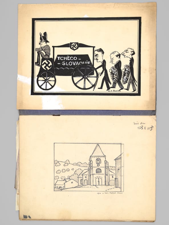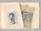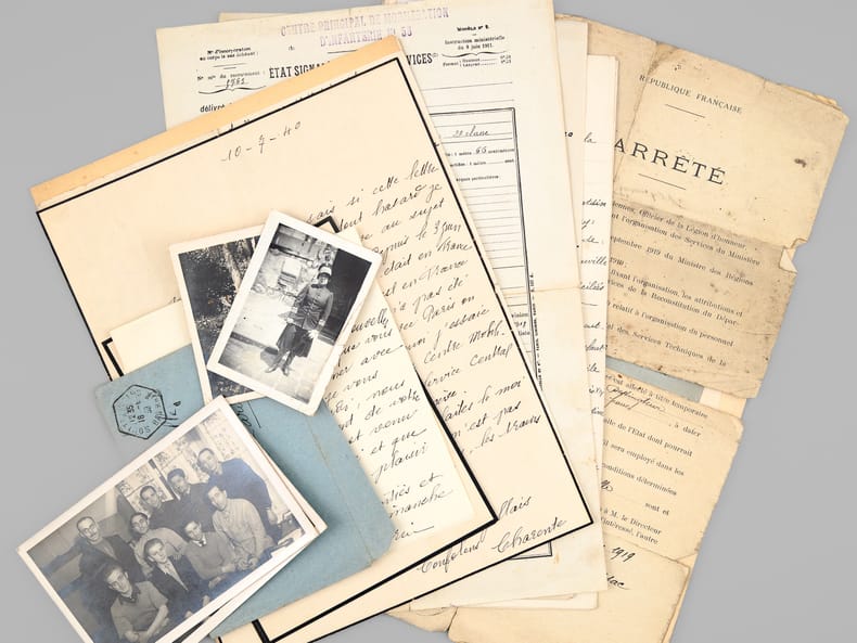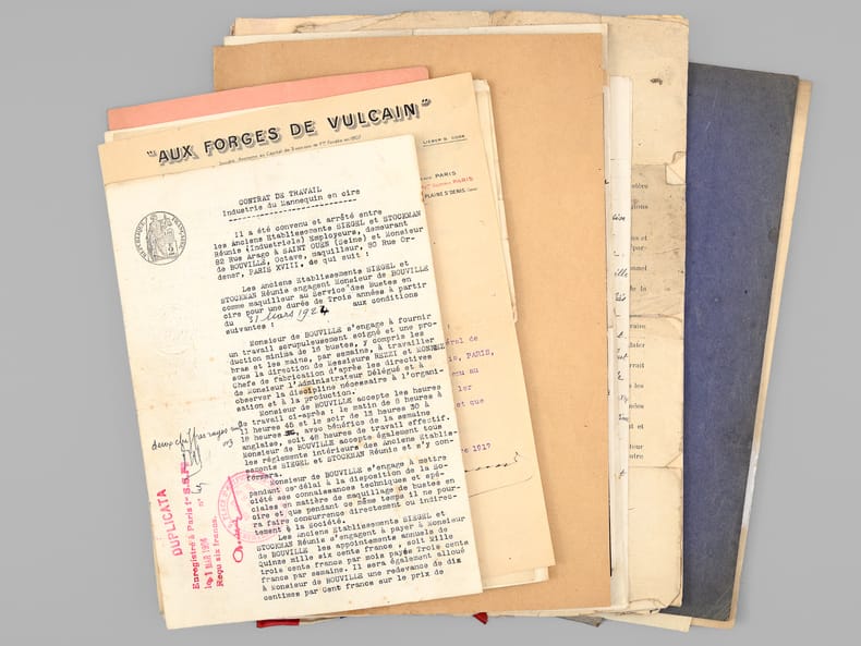 1 dossier contenant : [ Dossier d'archives sur Octave Louis Ernest Gossin de Bouville, dessinateur et décorateur ; Né à Neuvizy (Ardennes) le 21 mars 1899, marié à Henriette Vasseur : ] 2 cartes de prisonnier de guerre 1940-1941 ; Carte d'électeur 1938 ; Carte Ministère du travail Assurances sociales 1933 ; Curriculum Vitae signé de sa main (août 1937) ; Etat de service militaire ; "Pétition" concession cimetière (1952) ; Diplômes Ministère de la santé publique (don du sang) : 4 ; Extrait J.O. Médaille d'honneur du travail ; Photos : 5 ; Bulletins de paie : 15 (dont Imprimerie Curial-Archereau) + 5 (Mannequins Siegel, 19 rue Réaumur,Paris, 1935) ; Contrats de travail : 6 (Anciens établissements Grouvelle et Arquembourg, 1917 - Pierre Imans Mannequins d'Art 1924 - Aux Forges de Vulcain, 1917) dont un contrat de travail "comme maquilleur au Service des Bustes en cire" ; Lettres (courriers) : 8 (Jallais, Charente, nouvelles du Stalag) - 25 épreuves de bois gravés d'Octave de Bouville, 1 grand dessin original signé, 1 carnet de croquis (Ardennes : Eglise de Vaux-Montreuil, Moulin de Dendun, etc...) et 10 épreuves diverses ; Quittances d'assurance Mutuelle du Mans : 3 ; Reçus Assurances Sociales 1944-1945 : 17 + 2 ; Arrêté + attestation Ministère des régions libérées / Reconstitution foncière et cadastre : dessinateur (2 documents) ; Extrait d'acte de naissance ; ...