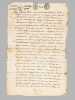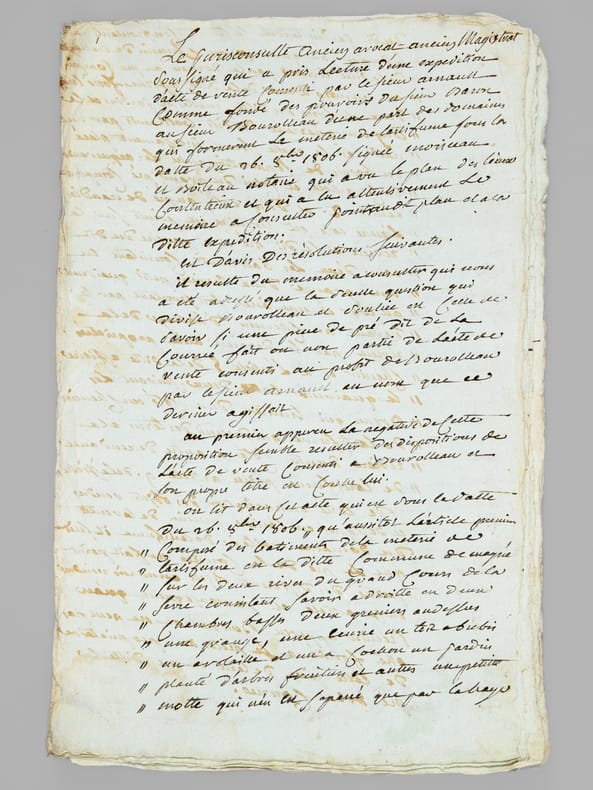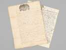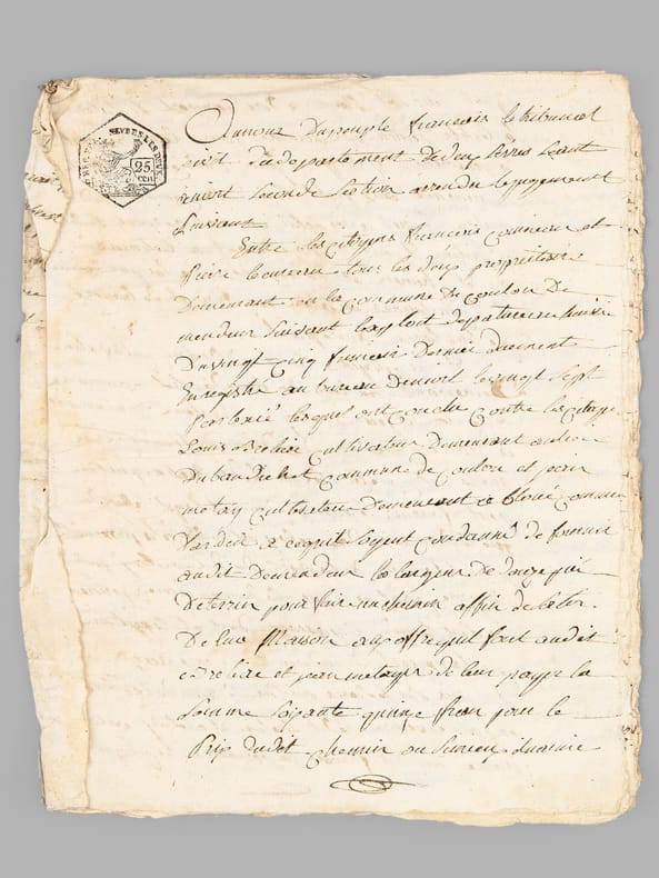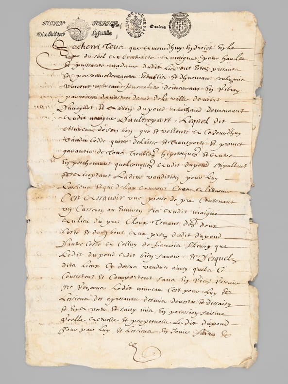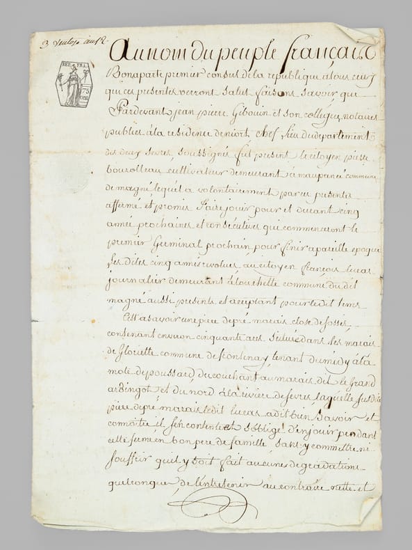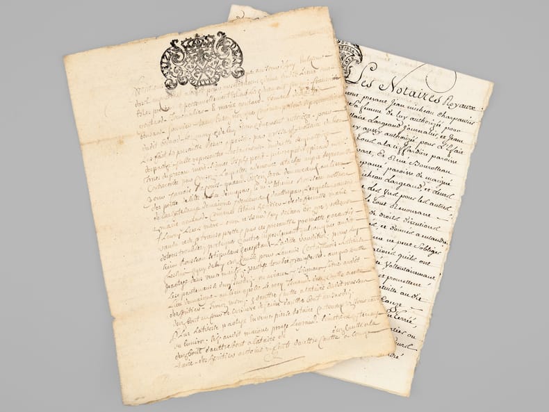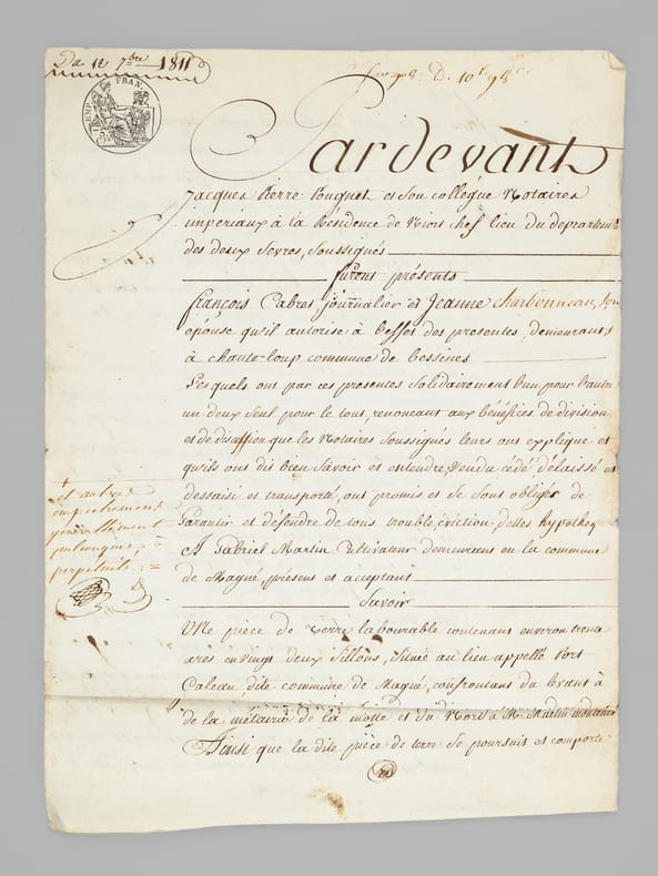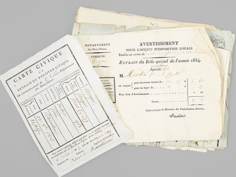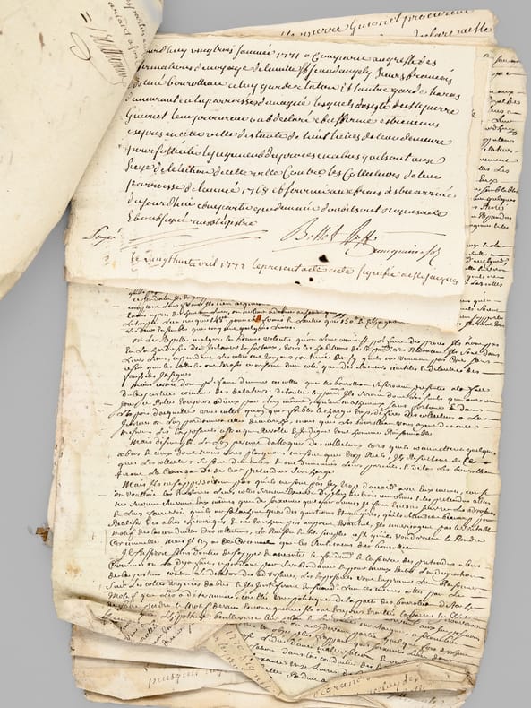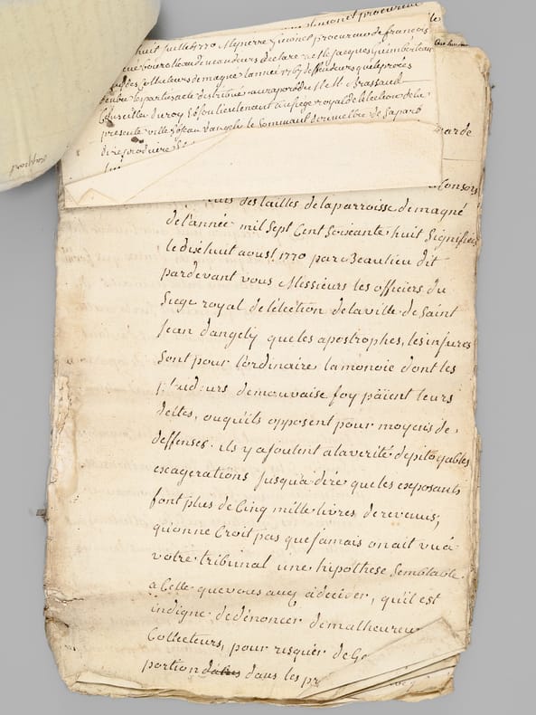 [ Lot d'archives XVIIIe et début XIXe relatifs à la commune de Magné [ Deux-Sèvres ]] I : 4 pièces XVIIIe dont acte de vente sur vélin, 8 ff. datés de 1697, acte de vente daté de 1680,II : Importante liasse de 38 documents : pièces réunies en défense vers 1767-1769 par François et René Bourolleau, garde-hara et garde étalon à Magné : "Les parties de François Bourolleau garde harras et René Bourolleau Garde Etalon répliquant aux ecritures de jean rodier et consors Collecteurs des tailles de la parroisse de Magné de l’année mil Sept Cent Soixante huit Signifiées le dix huit aoust 1770 par Beaulieu dit pardevant vous Messieurs les officiers du Siege royal de l’élection de la ville de Saint Jean d’angely que les apostrophes, les injures Sont pour l’ordinaire la monnoie dont les plaideurs de mauvaise foy paient leurs dettes, ou qu’ils opposent pour moyens de deffenses. ils y ajoutent a la vérité de pitoyables exagerations jusqu’à dire que les exposants font plus de Cinq mille livres de revenus; qu’on ne Croit pas que jamais on ait vue a votre tribunal une hipothese Semblable a Celle que vous avez à decider, qu’il est indigne de dénoncer de malheureux Collecteurs [ etc... ] ; III : Lot d'une quarantaine de pièces diverses (Carte civique de l'arrondissement de Niort de juin 1807, contract d'affermage, quittance, reçu divers, etc...) daté du Consulat, de l'Empire, de la Restauration et qq. documents postérieurs.
