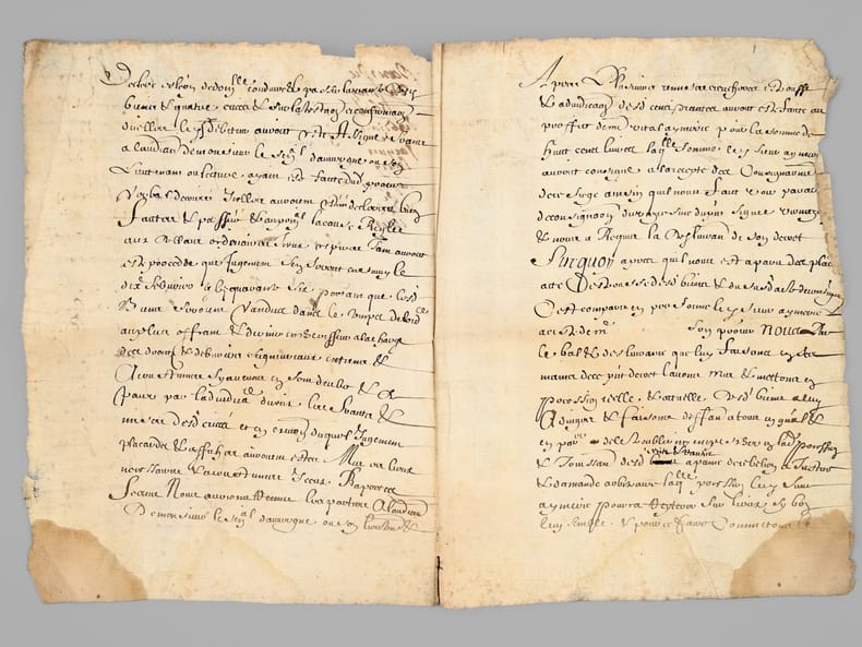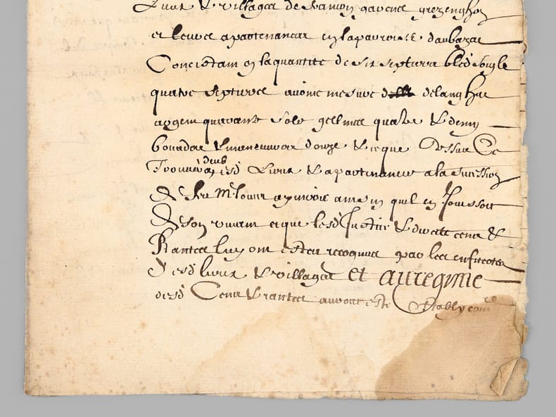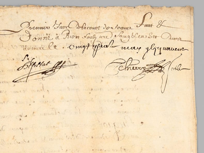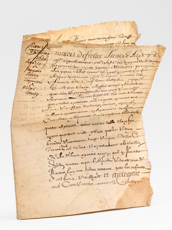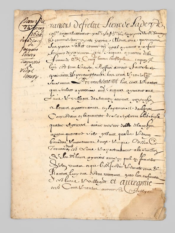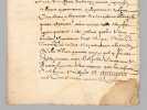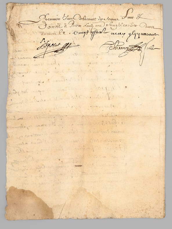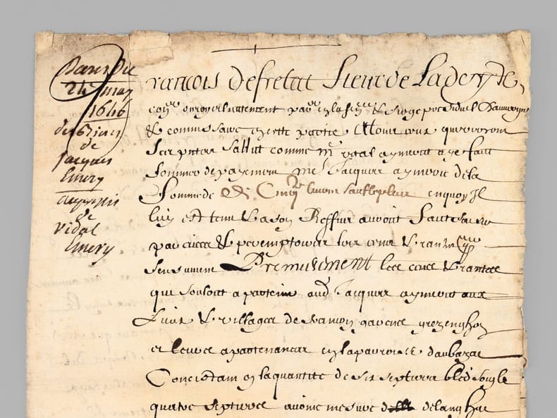 1 pièce manuscrite, de 2 ff.: [ Acte d'adjudication daté de Riom le 24 mai 1646, signé par François de Fretat Sieur de La Deyte : ] " Francois de Fretat Sieur de La Deyte, con(seill)er du roy en son parlement & siège présidial d'Auvergne et commissaire en cette partie [... ]" [ Concerne notamment l'attribution de terrains en la paroisse d'Aubazat ],
