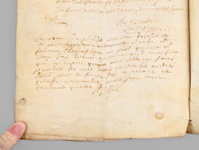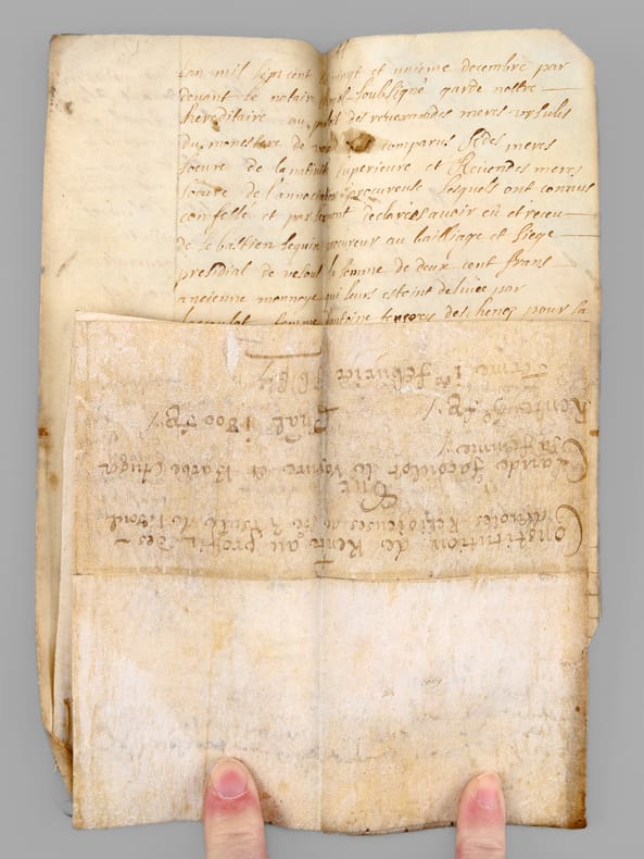 Intéressant témoignage sur la gestion des monastères par consitution de rente, à la fin du XVIIe siècle. L'ancien couvent des Ursulines de Vesoul (Haute-Saône), fondé à partir de 1680, accueille aujourd'hui le musée municipal d'archéologie et des beaux-arts. Jolie pièce. L'acte est signé "Lyautey" au verso. Claude Estienne Lyautey était alors secrétaire ordinaire de la ville de Vesoul.