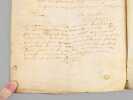 2 documents joints sur vélin d'un feuillet et 2 feuillets, circa 1667-1700 : Manuscrit : Acte de Constitution de Rente au profit des Dames Religieuses de Ste Ursule de Vesoul, capital de 1600 livres, rente de 8 livres due par les débiteurs Claude Jacoulot le Jeune et Barbe Hugot sa femme, terme au 1er fevrier 1667 et Acte de Cession partielle des droits du défunt Jacoulot, le 21 décembre 1700, à Maître Sébastien Seguin, "procureur au bailliage et siège présidial de Vesoul". Les Ursulines de Vesoul sont représentées par la Révérende Mère Soeur de la Nativité, Supérieure, et Révérénde Mère Sœur de l'Annonciation, procureuse