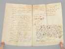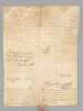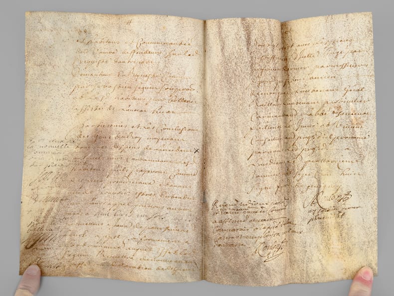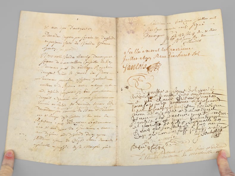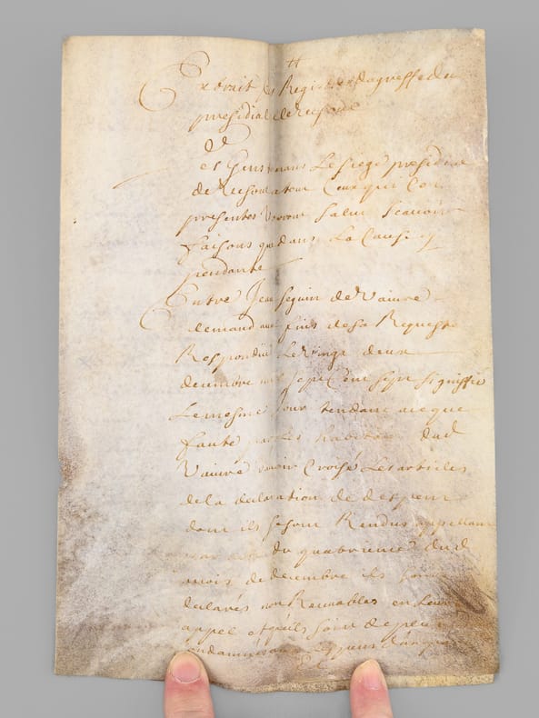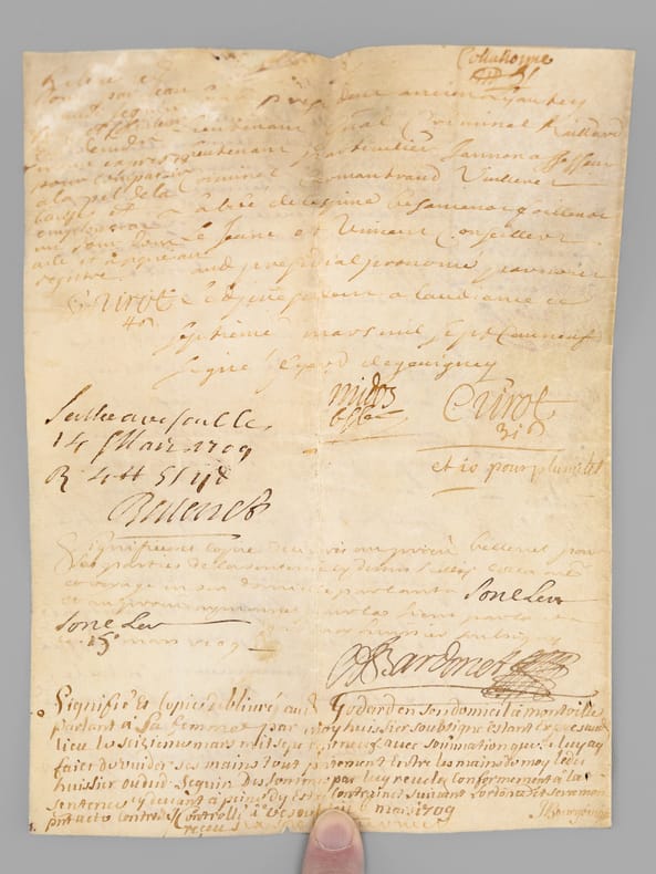 3 actes sur vélin de 2 ff., [ Acte judiciaire condamnant au dépens suite aux poursuites pour injures, Vesoul, juillet 1699 : ] "Extrait des Registres du greffe du Bailliage Royal de Vesoul. Le Bailly d’Amont au Comté de Bourgogne à tous ceux qui ces présentes verront salut, savoir faisons qu’en la cause pendante audit Bailliage. Entre Claude Carteron de Montoille, défendeur d’une part. Et Sieur Jean Seguin de Vaivre, en la qualité qu’il agit demandeur aux fins de son exploit du septième juillet mil six cent nonante neuf contrôlé le neuf, par lequel il a conclu à ce que ledit défendeur vienne déclarer qu’il tient Nicolas Seguin fils dudit demandeur, né et exempt de vice résultant des injures mentionnées audit exploit, qu’il juge pour l’amende honorable et pour la profitable à ce qu’il soit condamné à lui payer la somme de mil livres sauf taxe [ etc...…] » [ Avec un second acte joint daté de 1709, demande de recouvrement de créance ]