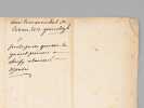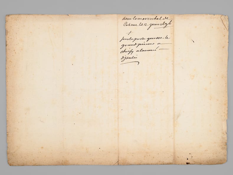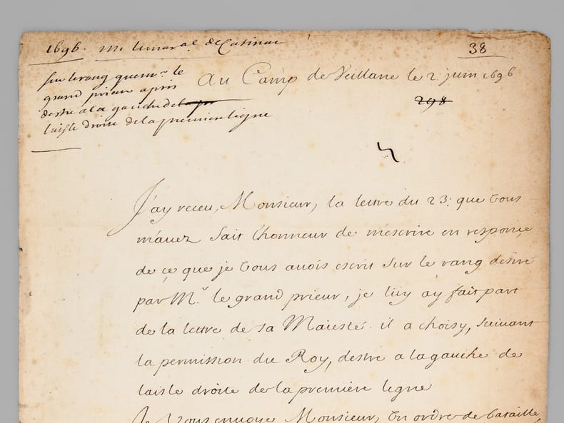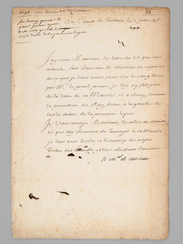 Feuillet double in-4 (34 x 23 cm), filigrane couronnée à la grappe de raison, initiales P. E. F. V. : [ Lettre autographe signée du Maréchal de Catinat, daté du Camp de Veillane, le 2 juin, 1696, "sur le rang que le Grand Prieur", Philippe de Bourbon "a choisy à l'armée d'Italie" ] "J’ay receu, Monsieur, la lettre du 23: que vous m’avez fait l’honneur de m’escrire en responce de ce que je vous avois escrit sur le rang désiré par Mr. le grand prieur, je luy ay fait part de la lettre de sa Majesté. Il a choisy, suivant la permission du Roy, d’estre a la gauche de l’aisle droite de la premiere ligne. Je vous envoye Monsieur, cet ordre de bataille tel que j’ay l’honneur de l’envoyer a sa Majesté. Je suis avec verité et beaucoup de respect votre très humble et très obéissant serviteur" [ Signé : ] Le M[aréch]al de Catinat" et au verso : "de M. le mareschal de Catinat le 2. juin 1696", "sur le rang que le grand prieur a choisy à l'armée d'Italie".