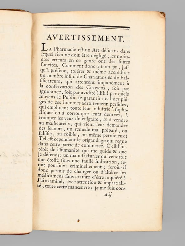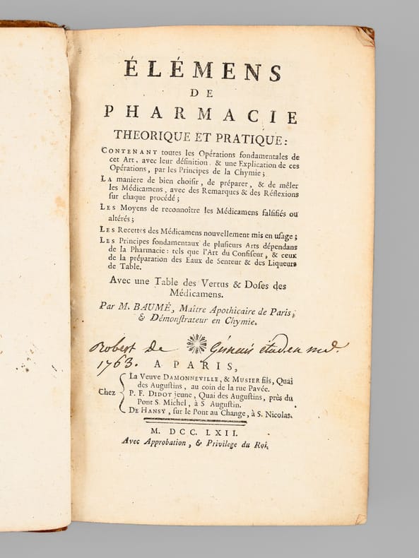 Rare exemplaire de l'édition originale des "Éléments de Pharmacie théorique et pratique" du savant pharmacien et chimiste Antoine Baumé (1728-1804). L'exemplaire est parfaitement conforme à la description fournie par Pierre Julien et René Weitz dans leur belle étude des différentes éditions des "Eléments de Pharmacie", et conforme à "l'exemplaire de la Faculté de Pharmacie de Paris" qui "comporte en outre, in fine, un cahier de 4 pages : le catalogue des livres de médecine de P.-Fr. Didot, l'un des co-éditeurs du volume". Etat satisfaisant (reliure frottée avec coiffe sup. arasée, manque le coin supérieur au premier plat, coupes frottées, ex-libris ms. d'un étudiant en médecine de l'époque en page de titre) pour ce rare exemplaire qu'une petite restauration saura valoriser. (Julien & Weitz, Revue d'Histoire de la Pharmacie, 1979, pp. 33-56)
