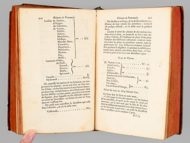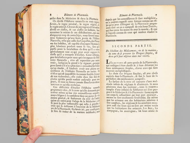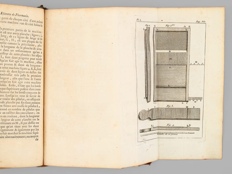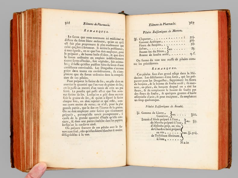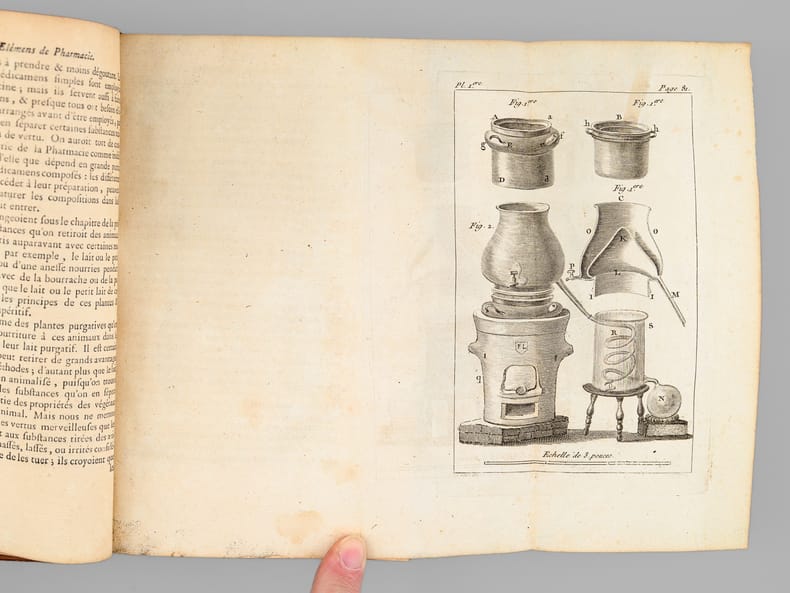 Par M. Baumé, Maître Apothicaire de Paris & démonstrateur en Chymie, 1 vol. fort in -8 reliure de l'époque pleine basane marbrée, dos à 5 nerfs orné, Chez La Veuve Damonneville, & Musier fils, P. F. Didot jeune, De Hansy, Paris, 1762, XVI-853 pp., 1 f. n. ch., 4 pp. (Catalogue Didot) avec 2 planches hors texte. Rappel du titre complet : Éléments de Pharmacie théorique et pratique, Contenant toutes les Opérations fondamentales de cet Art avec leur définition, & une Explication de ces Opérations, par les Principes de la Chymie ; La manière de bien choisir, de préparer, & de mêler les Médicaments ; Les Moyens de reconnoître les Médicaments falsifiés ou altérés ; Les Recettes des Médicaments nouvellement mis en usage ; Les Principes fondamentaux de plusieurs Arts dépendans de la Pharmacie ; Avec une Table des Vertus & Doses des Médicaments
