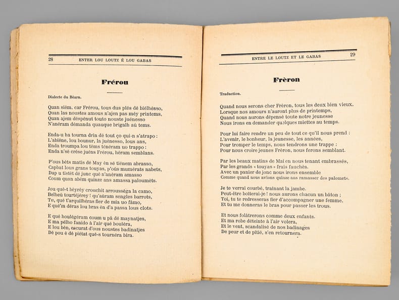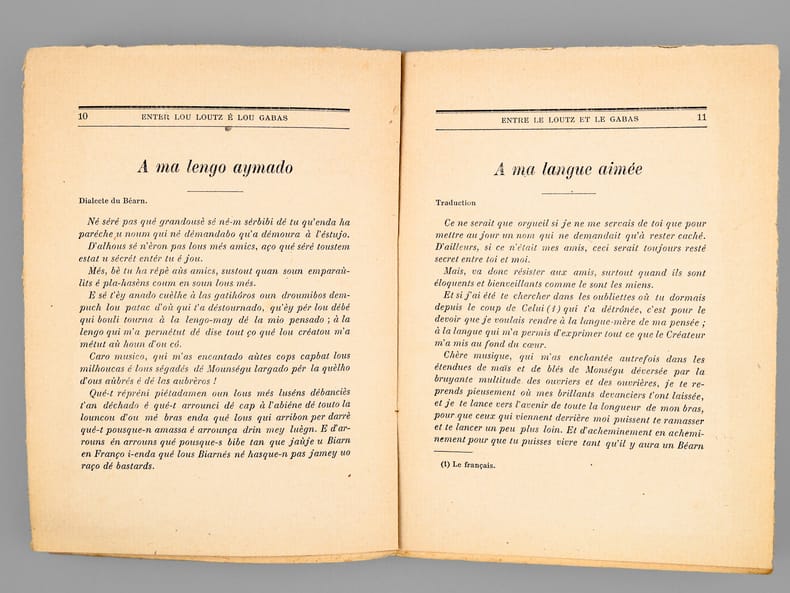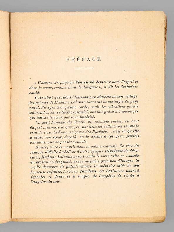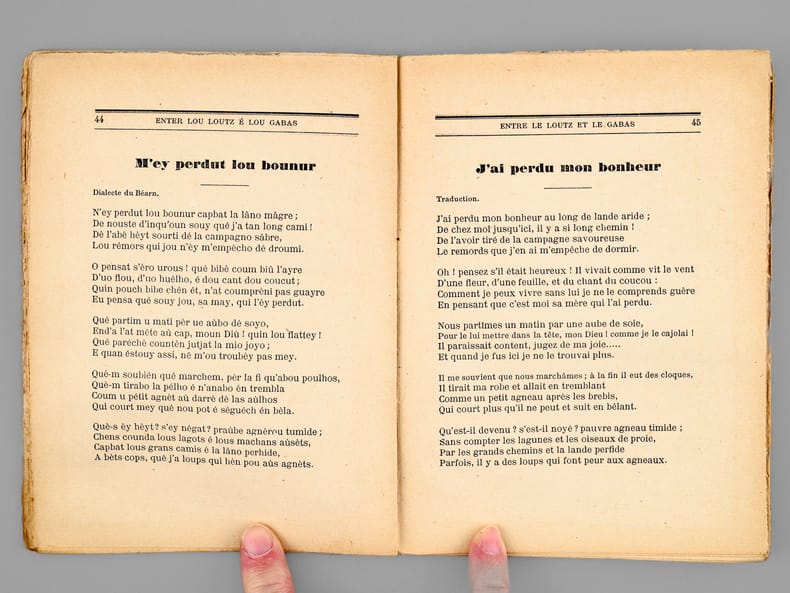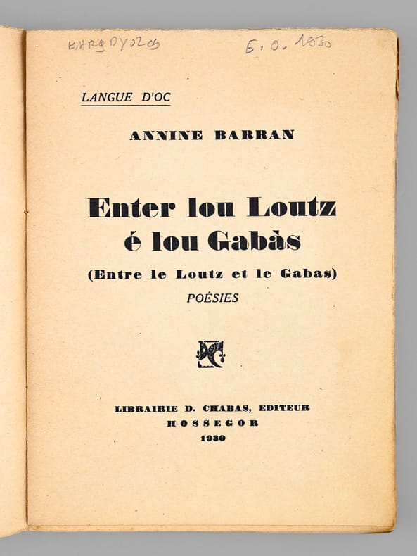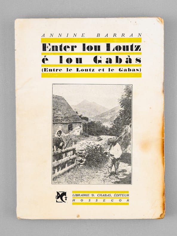 Les rivières Gabas et Louts, affluents de l'Adour, délimitent le territoire de Lacajunte dans les Landes. Située dans le Tursan, la commune de Lacajunte est limitrophe des Pyrénées-Atlantiques. Rare exemplaire de ce recueil de poésie bilingue, gascon et français. Le célèbre éditeur landais d'origine lituanienne David Chabas (1895-1996) avait commencé ses publications régionalistes dès 1926. Etat très satisfaisant (couv. un peu frottée).