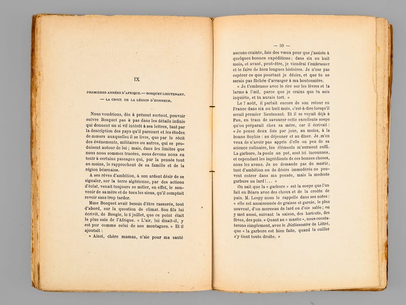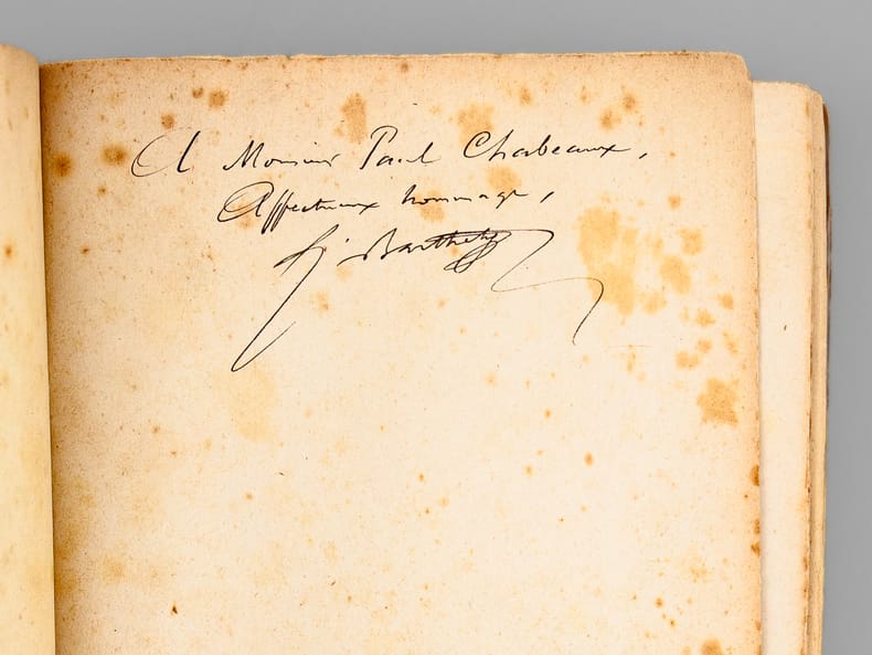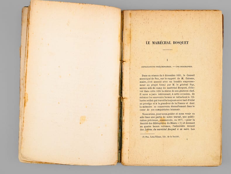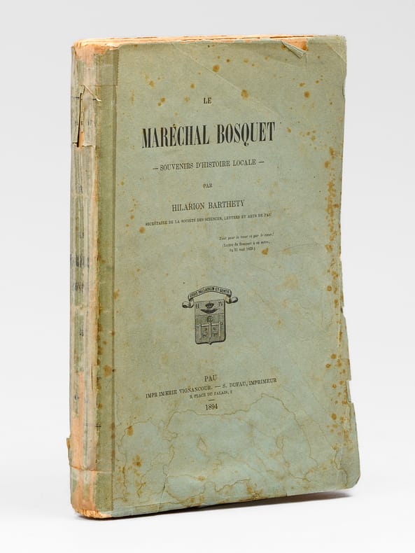 Envoi de l'auteur, l'historien et archéologue du Béarn Hilarion Barthéty (1842-1913) à Paul Chabeaux. Le maréchal Bosquet (1810-1861) né à Mont-de-Marsan et mort à Pau, est célèbre pour sa conduite lors de la conquête de l'Algérie et pendant la guerre de Crimée. Prix en l'état pour cet exemplaire à faire relier (exemplaire très faible avec adhésif en dos).