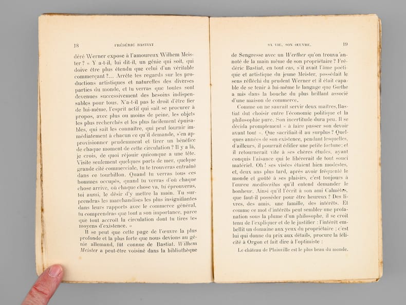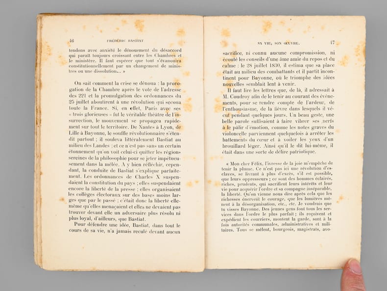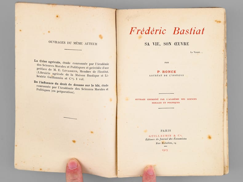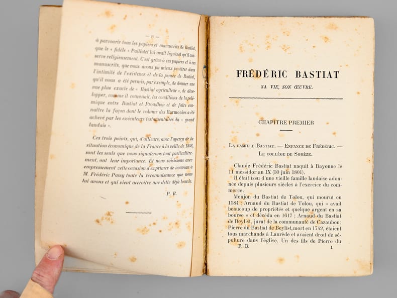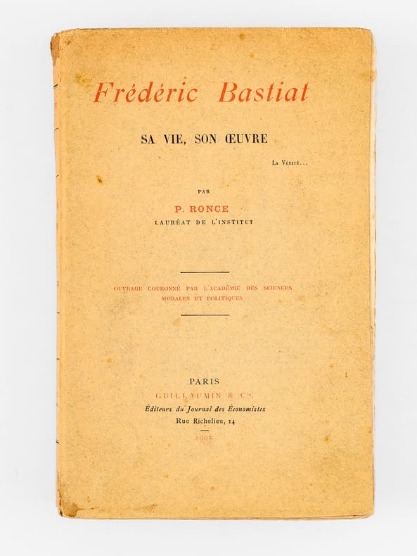 Rare exemplaire de l'édition originale de cette biographie du célèbre économiste Frédéric Bastiat Etat très satisfaisant (petites mouill. et usures au dos en coiffes, des rouss., bon état par ailleurs).