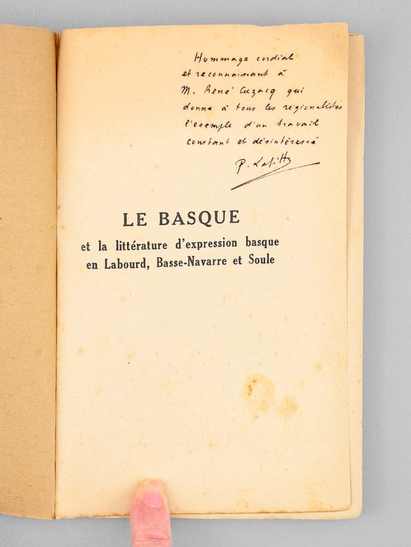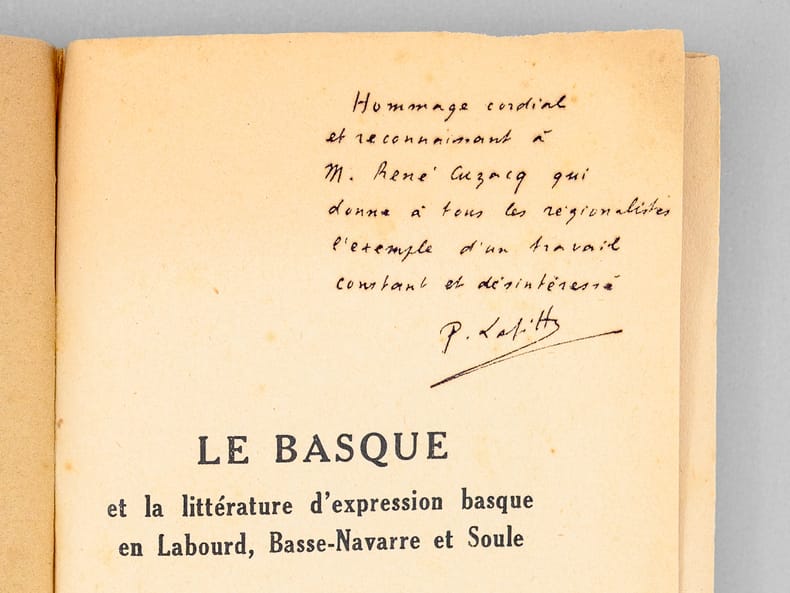 Bel envoi de l'auteur en "hommage cordial et reconnaissant à M. René Cuzacq qui donne à tous les régionalistes l'exemple d'un travail constant et désintéressé". René Cuzacq était professeur au lycée de Bayonne. Etat très satisfaisant (couv. un peu frottée).